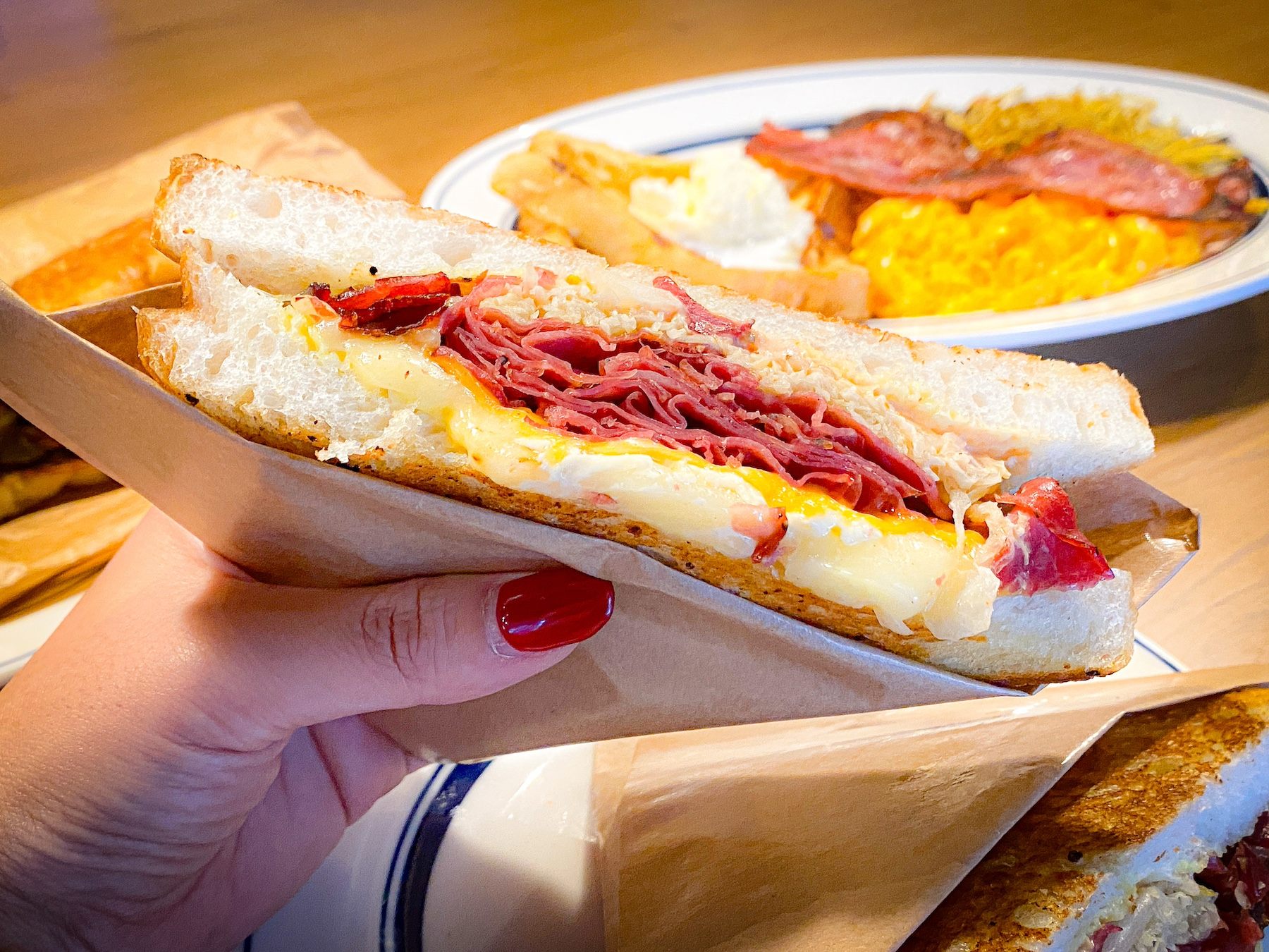 「ルーベンサンド」は、リンゴ酢などを入れてつくるロシアンドレッシングとマスタード、ザワークラウトなどが絶妙なバランスで入っています。とろ〜りとろけた4種類のチーズが、それらの食感を包み込みクセになりそう。お皿に収まりきらないほど大きな「フィリーチーズサンドイッチ」は、フィラデルフィアのステーキサンド。これ目当てに訪れる人も多い人気メニューです。その大きさ、なんと10インチ(25cm)超え。コーヒーを相棒に、ビックサイズのサンドイッチを食べる至福のひとときが過ごせます。