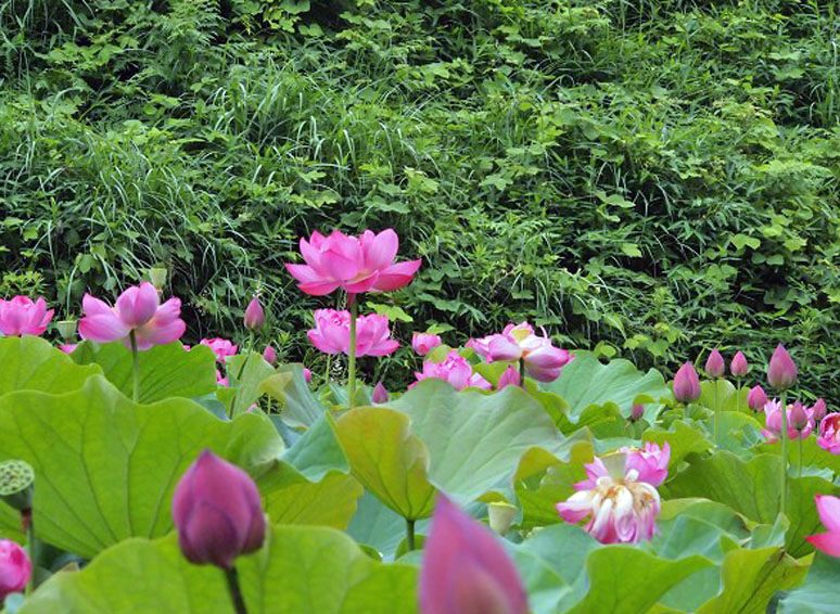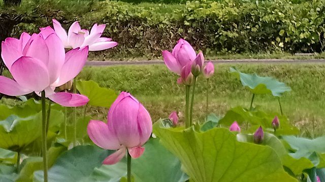 蓮の季節ですね。毎年訪れている久米南町の宮地蓮池にやってきました。今年は棚によって蓮の数がさまざまで、いちばん下のガセボのある蓮がとてもきれいでした。スタッフの方もこの下の池の蓮に関しては自慢げでした。