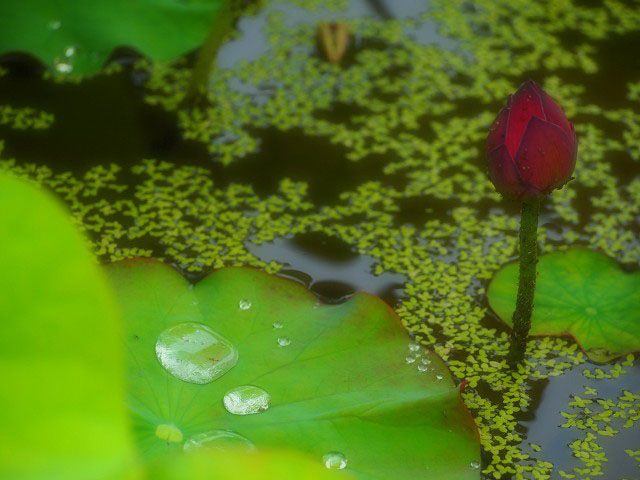 決して濡れることがないそうです。泥水から顔をのぞかせたばかりのつぼみを見つけました。つぼみも泥に染まっていません。