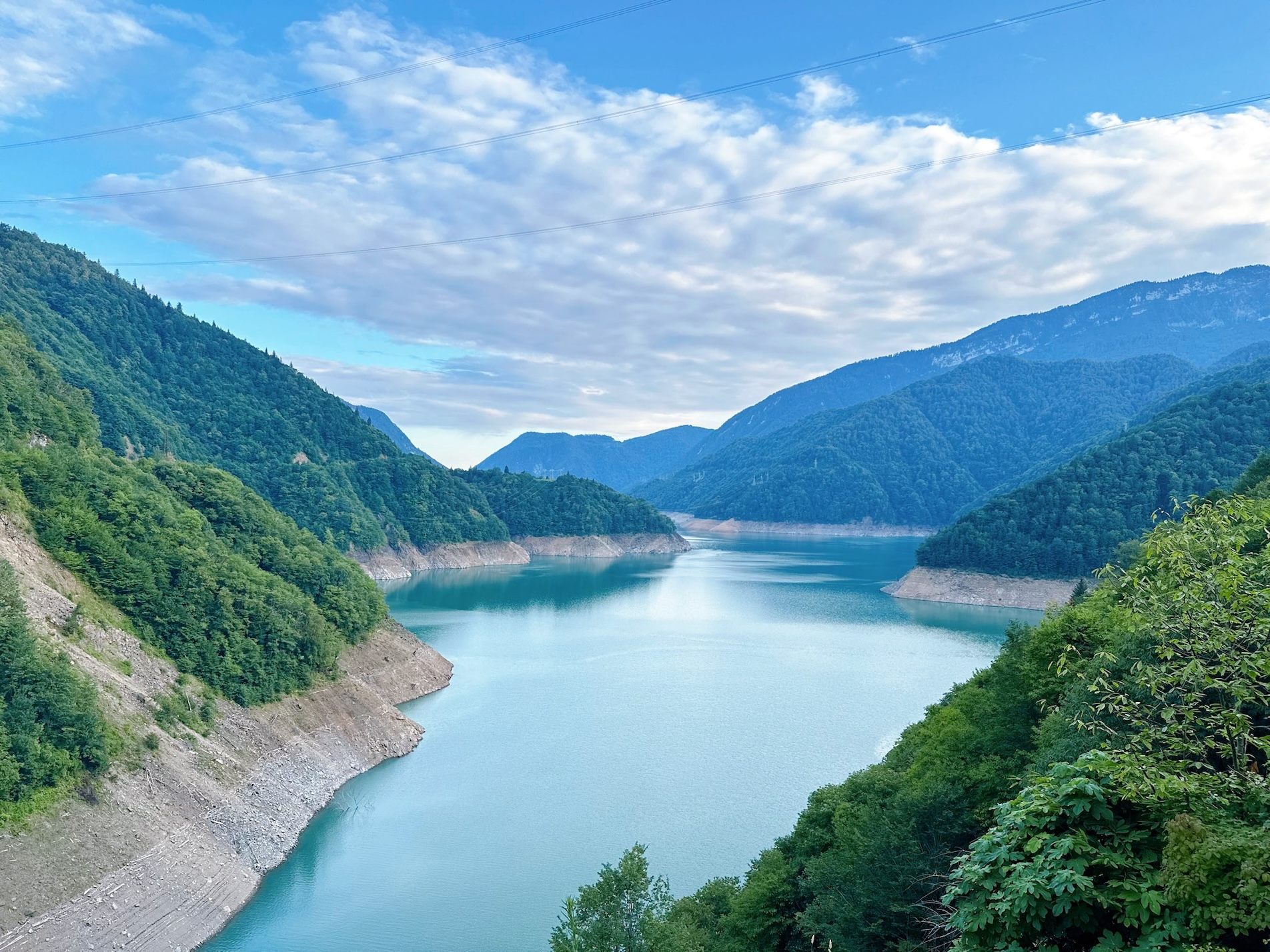 前述のダムの歴史や、ダムの仕組みなどを見学したい場合は入場することが最適ですが、もし時間がなく、湖水の風景を見てみたいだけ! という場合であれば、メスティアへさらに車を走らせると、そこからの道中はダム湖に沿って進んでいくので、夏のお天気のいい日であれば、きれいなエメラルドブルーの湖水を車窓から楽しむことができますよ。
