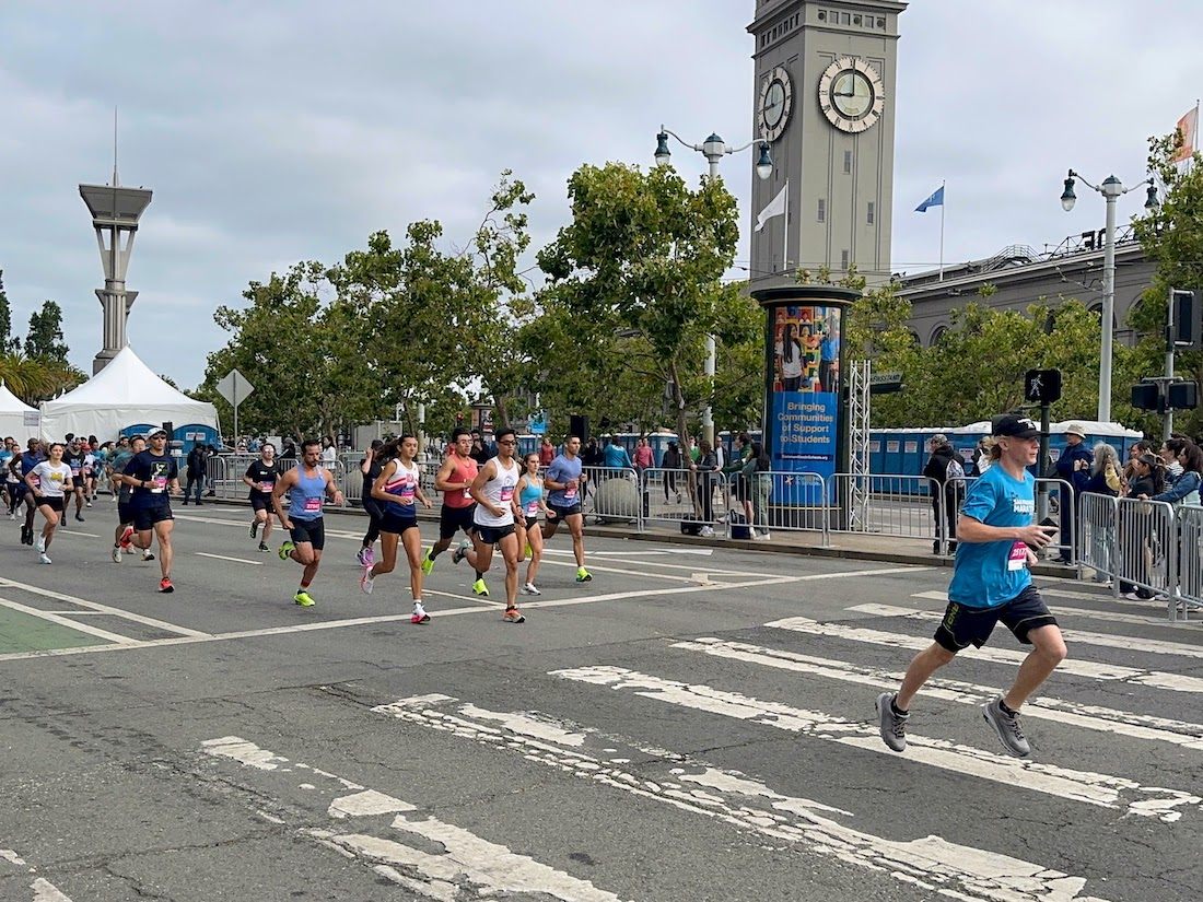 この日は、午前中は霧が立ち込める肌寒い日となり、ランナーにとっては絶好のコンディション。ゴールとスタート地点となるエンバカデロ・フェリービル付近は多くの人でにぎわいました。
