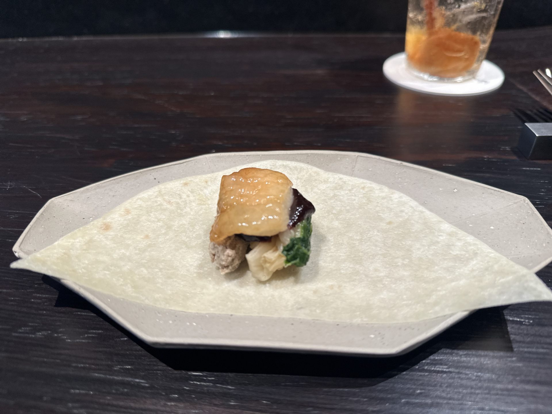 食堂と言いながら、お洒落な割烹のような空間で、いきなり火を使ったパフォーマンスから始まります。じっくりと火を通して、皮をパリパリに仕上げたアヒルを藁焼きで香りづけしています。カウンター越しに藁焼きの良い香りが漂います。