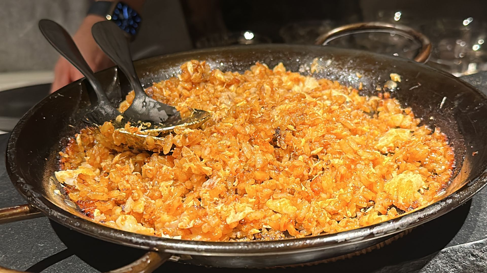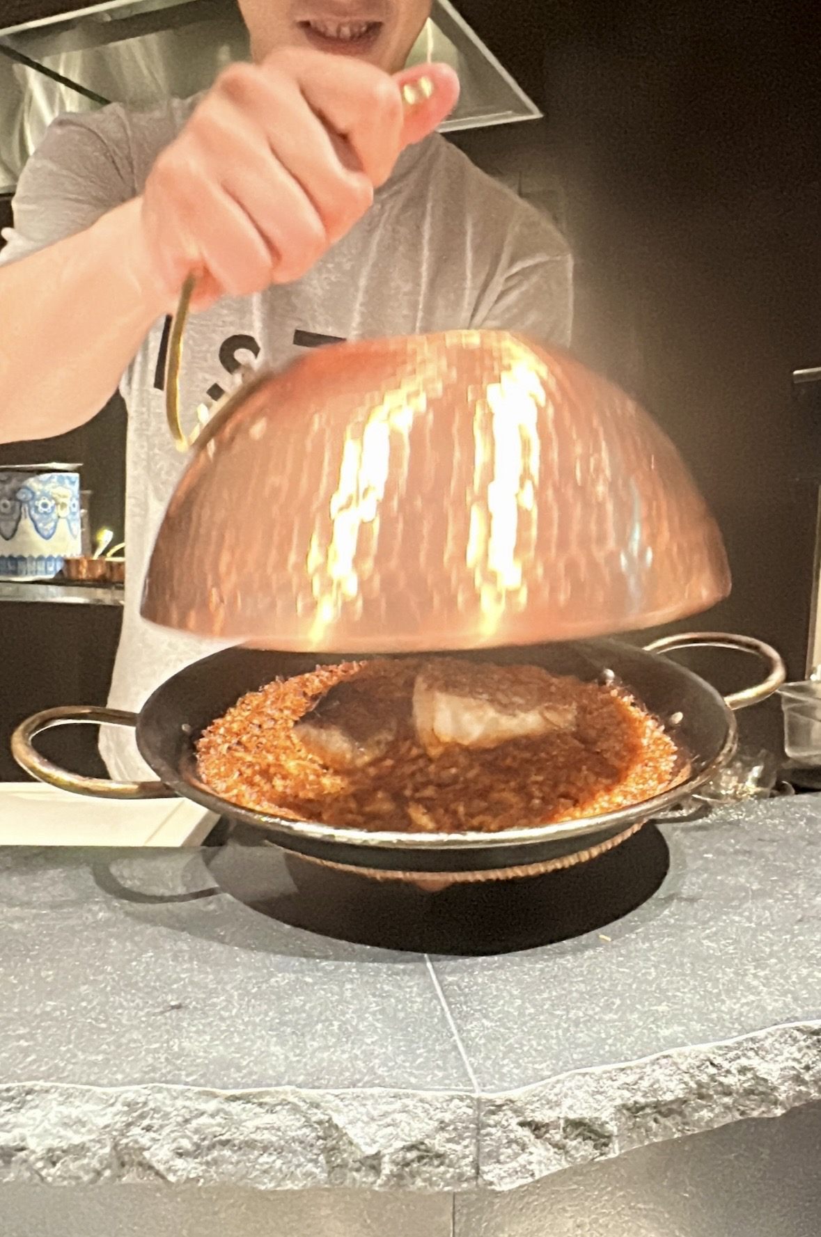 この日の鮮魚はスズキです。蓋を開けてくれた時に赤いパプリカ色のパエリアの中で、スズキが鮮やかな白色の存在感を放っています。通常のサフランの代わりに発酵パプリカが使われ、色付けと優しい酸味がアクセントの一石三鳥名物赤いパエリアです。パリパリのネギと生姜が散らされ、良い仕事しています。