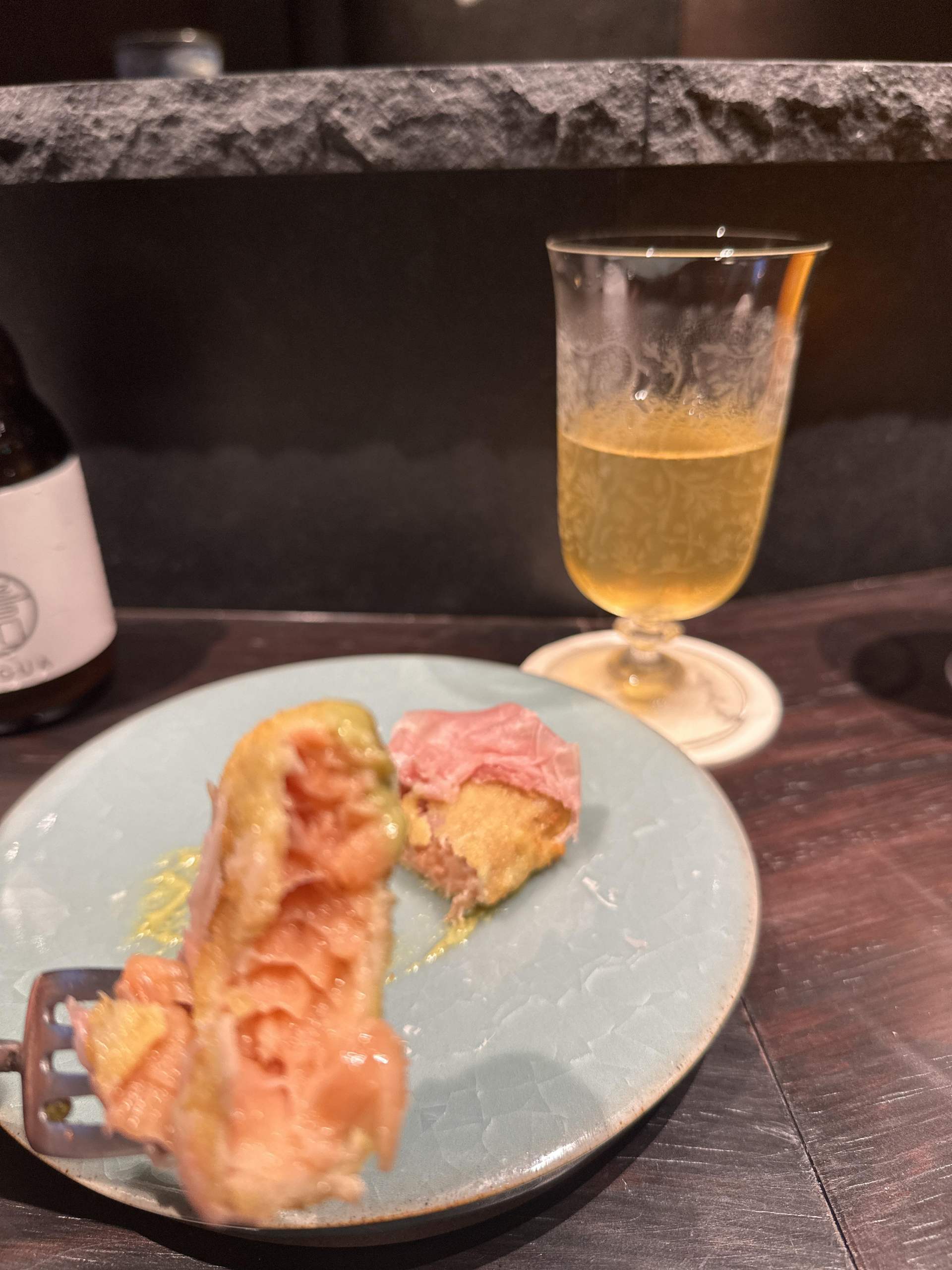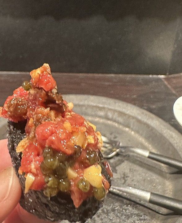 ゼッポリーネの外はサクッと中はふわふわの食感、但馬牛のタルタルとキャビアをのせて頂きます。お肉の旨味が絡まり、幸せの口です。