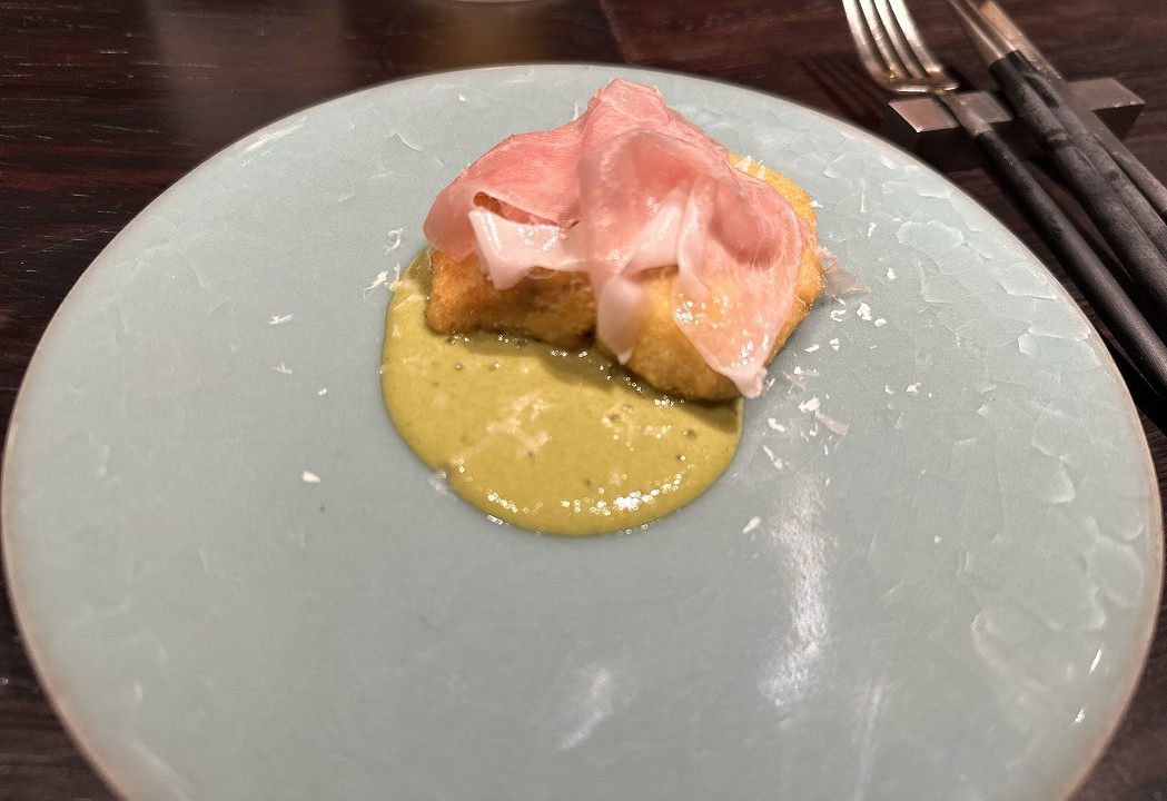 サクラマスをカツに、アクセントに発酵青唐辛子の優しいグリーンカレーソースが敷かれ、カツの熱でとろけるほどの薄さの生ハムと一緒に楽しみます。