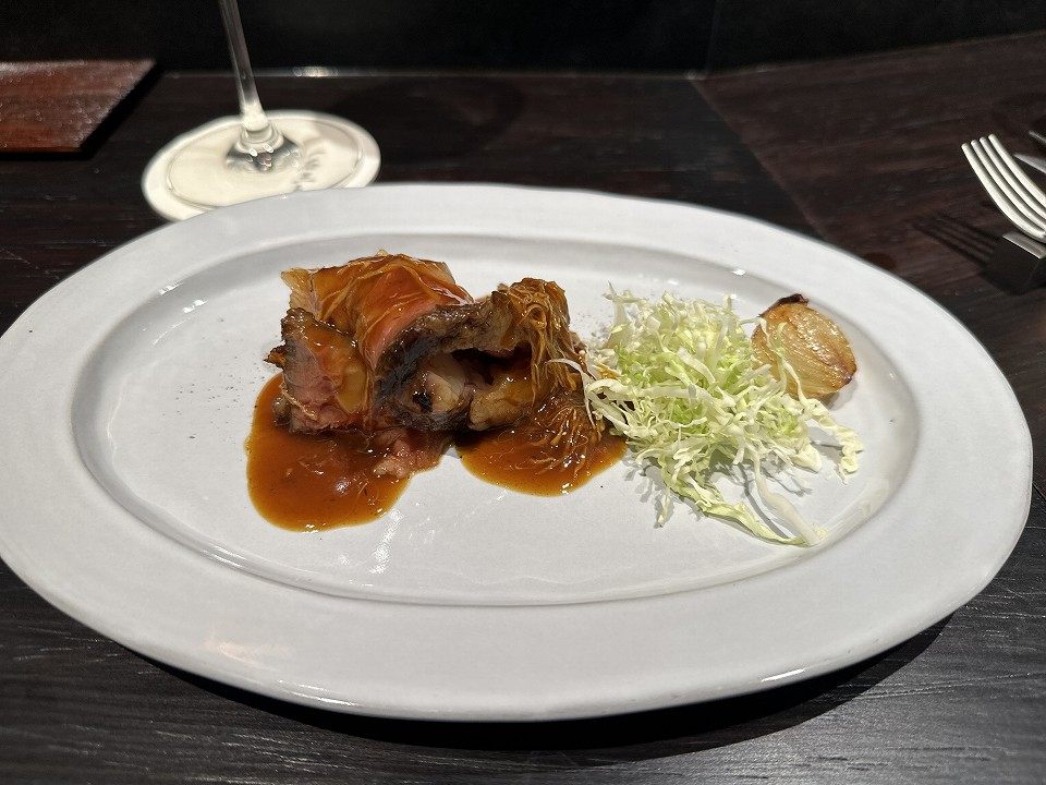 最高級スペイン産の豚肉ベジョータを使い生姜焼きを作ったらどうかと言う好奇心から生まれたメニューだそうです。シェリー酒の香りと丸ごとオープンでローストした玉ねぎの甘味がマッチした超贅沢な大人の生姜焼きです。ベジョータがとても柔らかく、奥の深い旨味タップリのお味で、ワインが似合う生姜焼きです。