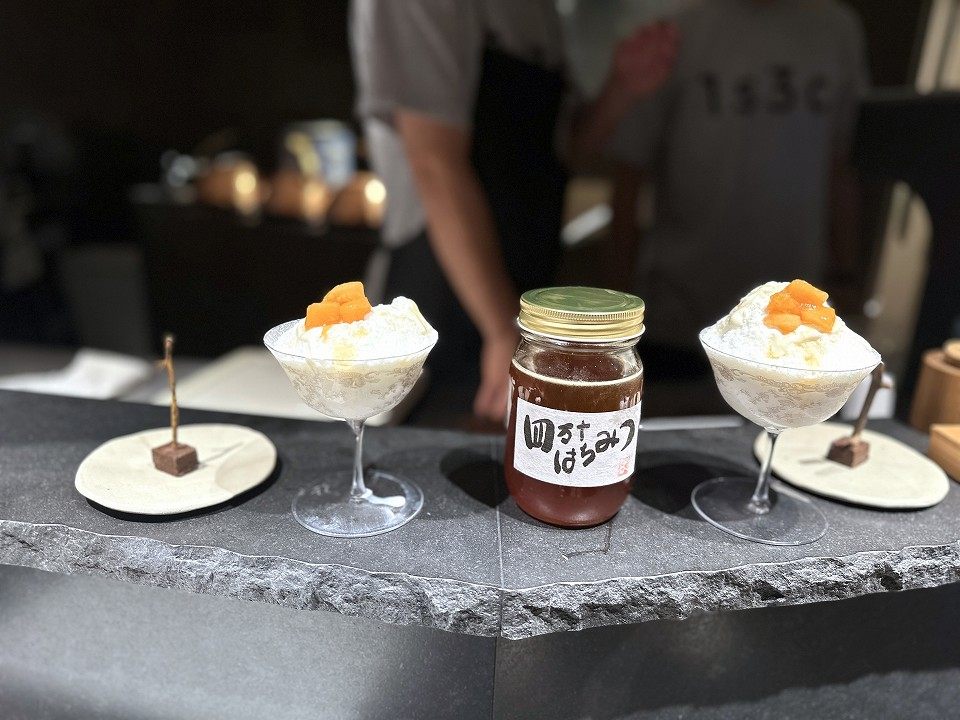 テーマは「お酒×氷×季節」、ココナッツミルクがベースの氷を瞬間冷凍、削り、北海道産赤玉メロンが添えられ、ソースは、山椒をアクセントにしたホワイトチョコレートとマスカルポーネ。仕上げに四万十産の蜂蜜がかけられ、とことん、こだわったラグジュアリーな大人のかき氷です。