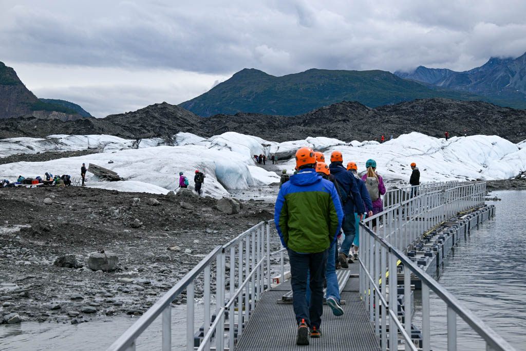 ヘルメットを借りて、氷河の手前に広がる池を渡る浮き橋を通って向かいます。