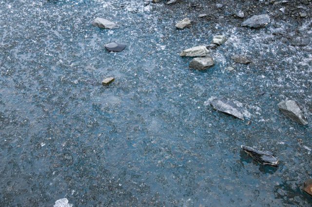 先端まで歩いていた土のような地面、実は氷河でした。表土の下は氷です。ガイドさんが地面を掘って氷を採ってくれました。実際の氷河は、見た目の白い部分よりもずーっと広いようです。