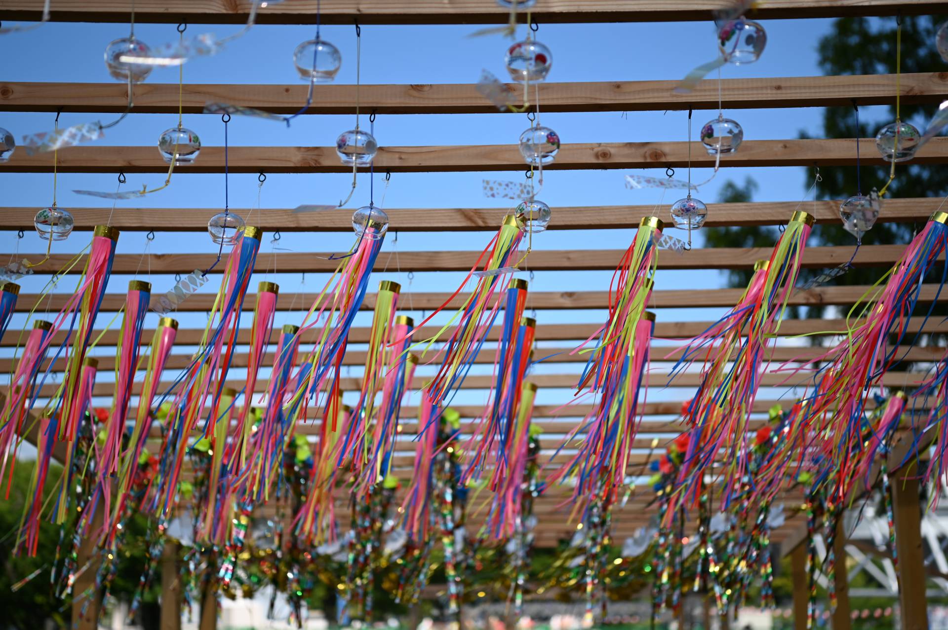 太陽の塔の周りには約50mの風鈴、風車、吹き流しが飾られた風の小径ができています。