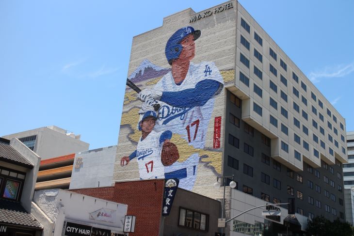 都ホテル ロサンゼルスの外壁には、大谷翔平選手の壁画が登場。近くには数か所にQRコードがあり、それを読み込んで壁画にカメラを向けると、動く大谷選手を観ることができます。