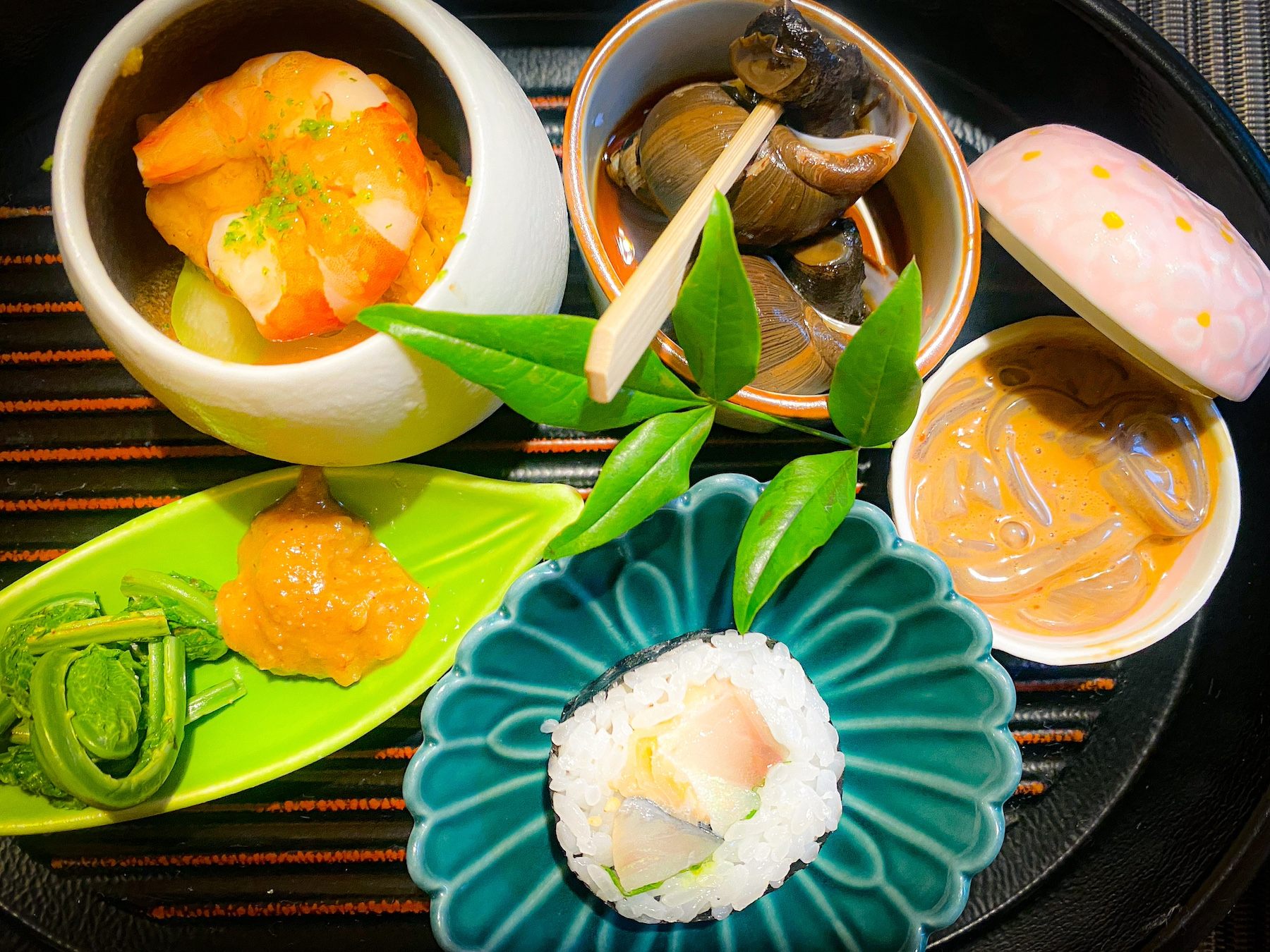 「九兵衛旅館」の自慢は、温泉はもちろん、海の幸・山の幸・野の幸をたっぷり楽しめる、お食事も見逃せません。どんなお料理が食べられるのか、ワクワクしながらお夕食に向かった私たちを出迎えてくれたのは、濃厚な胡麻の風味と柔らかい口あたりが絶妙な、鶴岡名物「胡麻豆腐あんかけ」。具沢山なので、お椀一杯でかなりの満足感があります。前菜は「こごめ胡桃味噌」や「黒バイ貝旨煮」「酒田沖船凍イカの塩辛」などが並びます。中でも「夏野菜と魚介の旨出汁ジュレ」は、海老やウニ、季節のお野菜が出てき感動もの。どの前菜も美味しくて一気に箸が進みます。