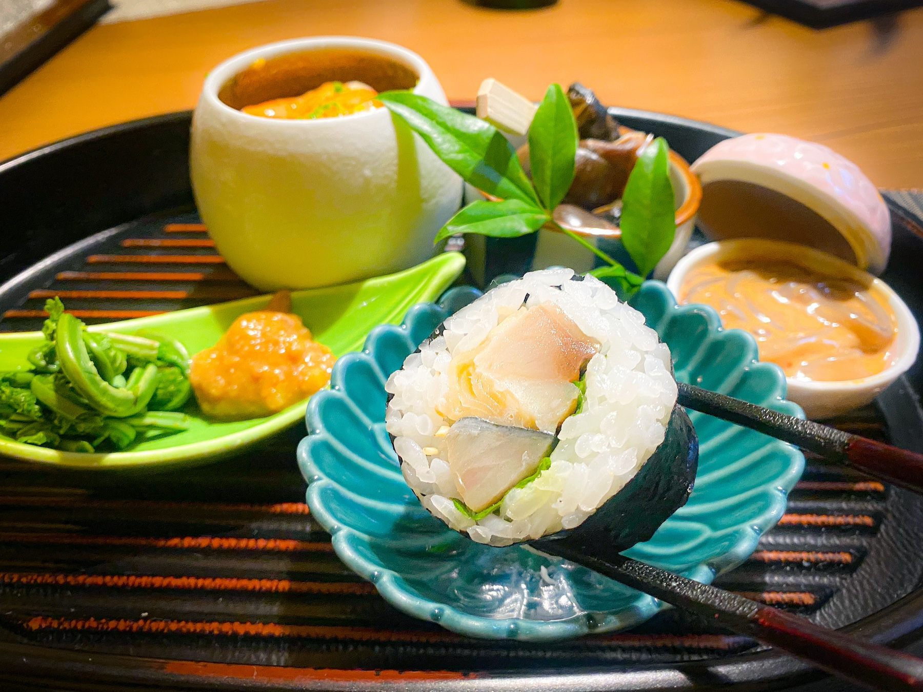 季節の野菜でつくる名物の和風ムースは、とうもろこしが登場。見た目はプリンのようですが、とうもろこしの旨みを感じます。焼き鯛茶漬けは、薬味がたくさんあるので、自分好みにアレンジしていただきましょう。鯛そのものの塩味がやや強めなので、程よくご飯が進みます。手作りあんみつは、抹茶とバニラのアイスが入っていて、ぎゅっと寄せ集まった見た目も華やかな甘味。優しい甘さなので、ほっと一息、美味しい時間の締めに最高でした。