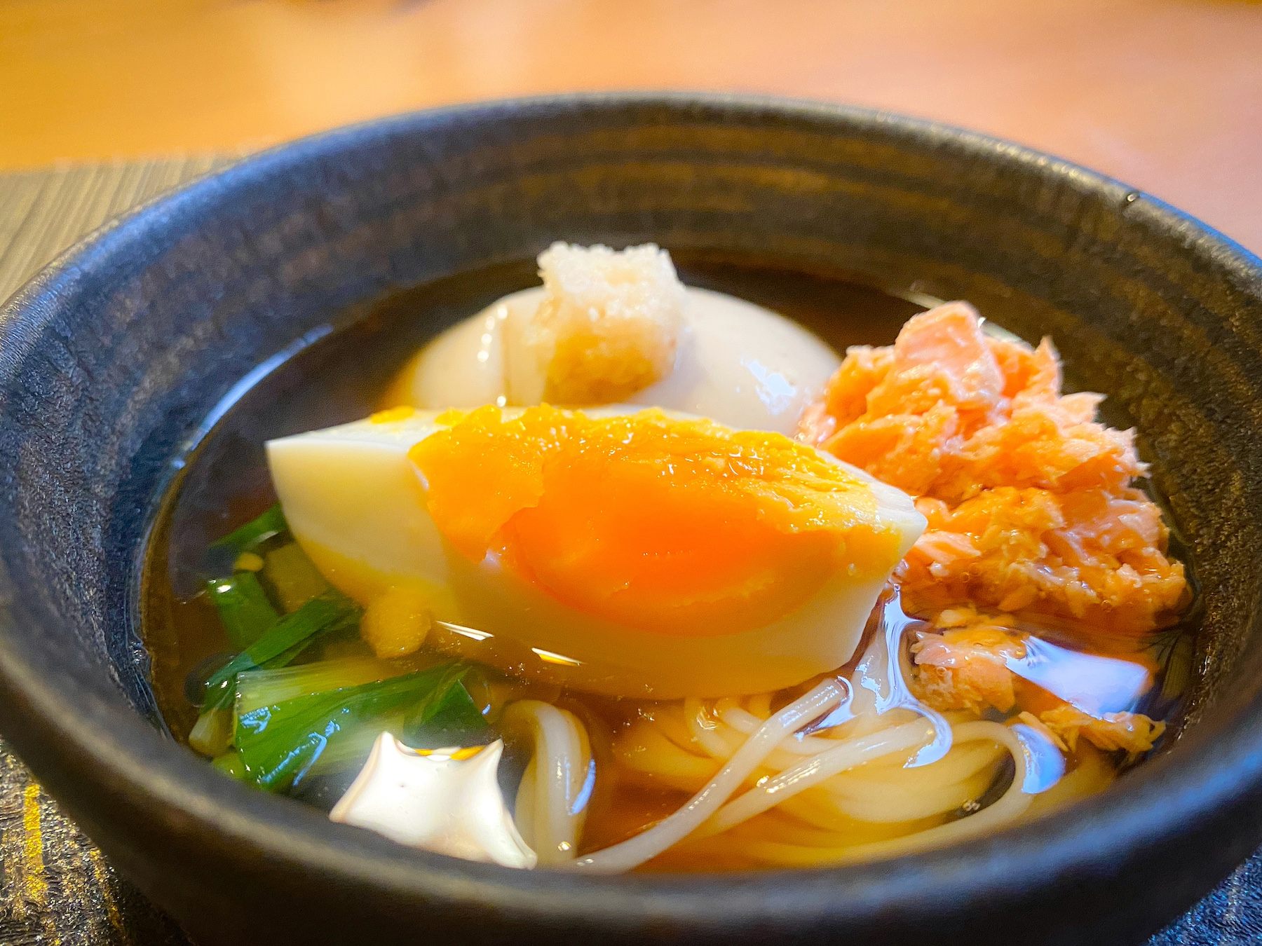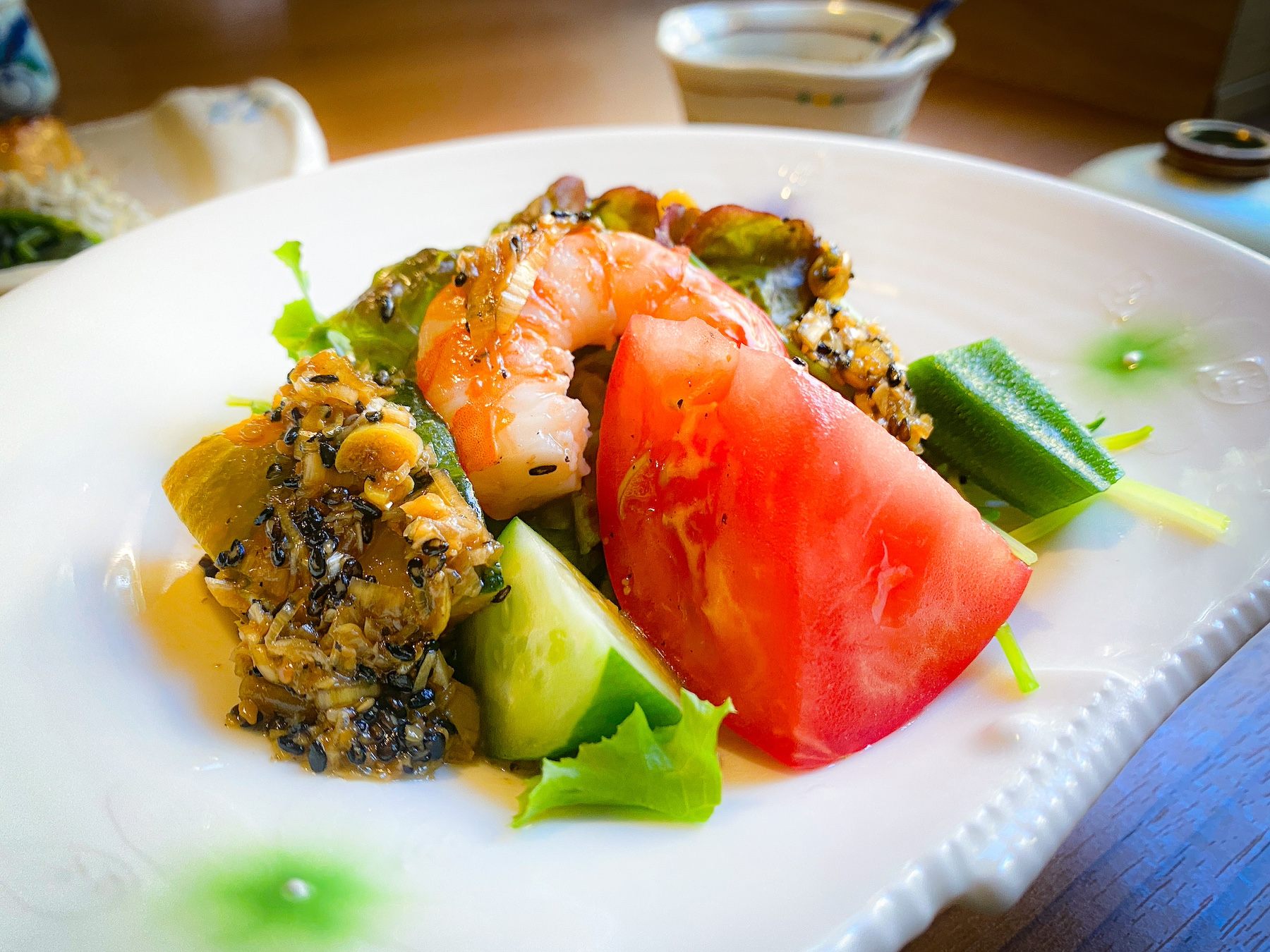 予想を超えた味わいで、驚いたのはサラダに添えてある自家製黒胡麻ドレッシング。玉子焼きや、お豆腐に付けても美味しく食べられる、食感のいいドレッシングで、新鮮野菜のおいしさをグッと引き立ててくれます。