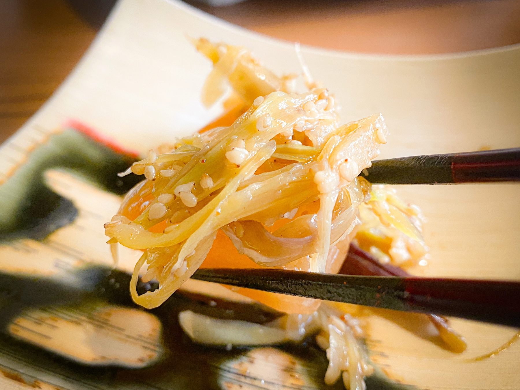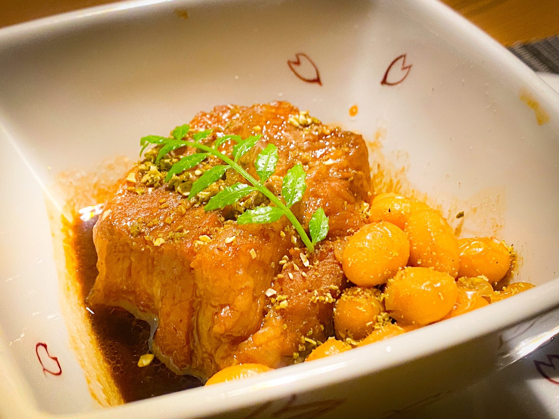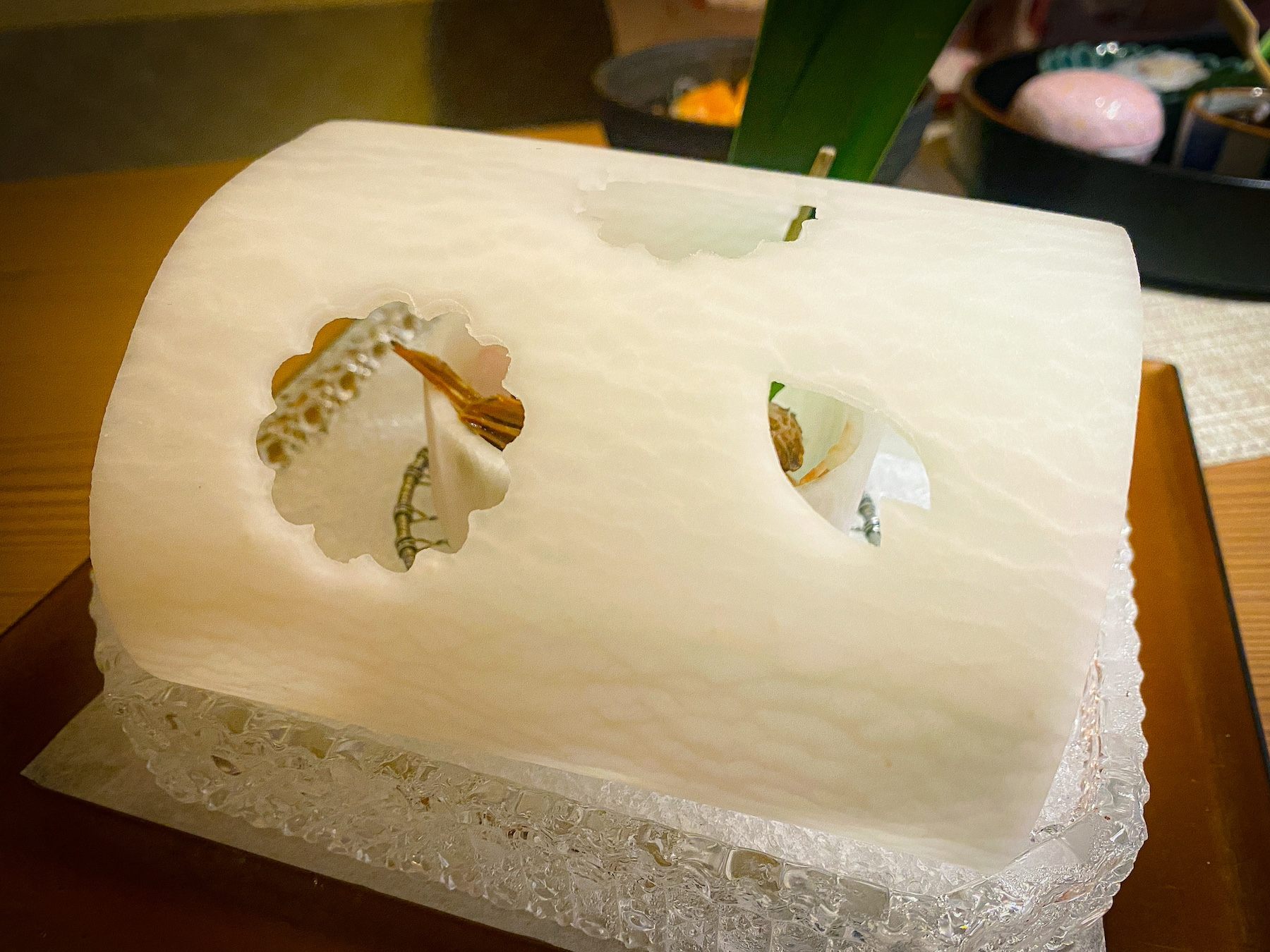 次に、お造りが運ばれてきたのですが、大根が美しくカットされており、目が釘付けになってしまいました。見て楽しい食べて美味しいとは、まさにこのこと。美しい曲線を描く大根の中に、歯ごたえのある引き締まったクエとガザ海老が入っています。お造りを食べたあと、この大根をいただくと、パリパリと美味しい音が響き、さらに食欲をそそります。