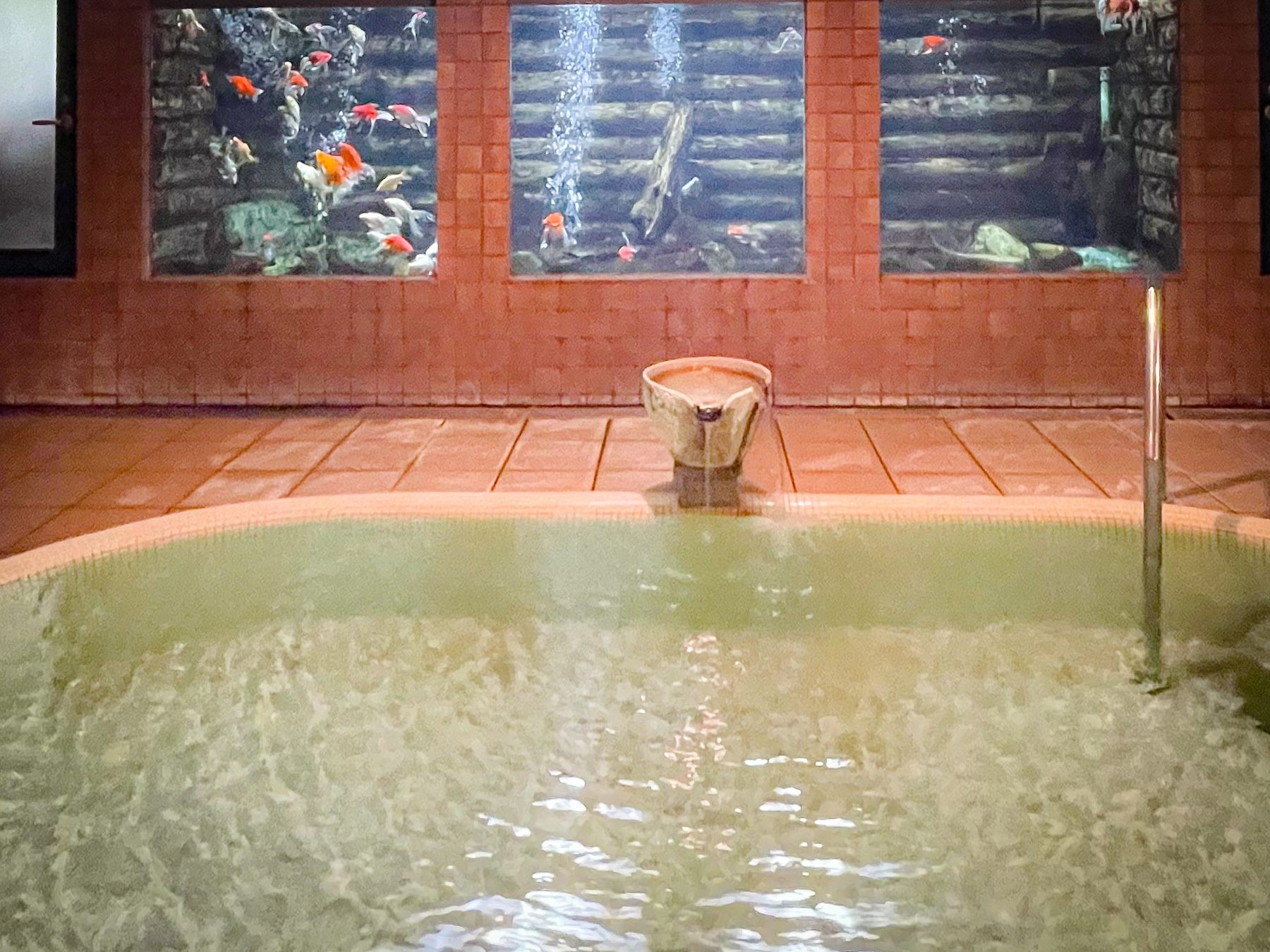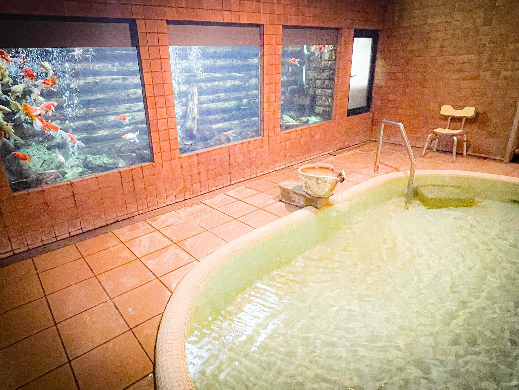「九兵衛旅館」には、四隅で可愛らしいうさぎが出迎えてくれる「山の湯」、迫力のある金魚の水槽がある「川の湯」、宿泊者が無料で利用できる「貸切風呂」があります。「山の湯」は、内湯と露天風呂があり、ゆっくり過ごすことができます。「川の湯」は内湯のみですが、金魚を愛でながら入浴する貴重な体験ができますよ。扉を開けると、大きな金魚の水槽が目に飛び込んでくるので、インパクト大です。