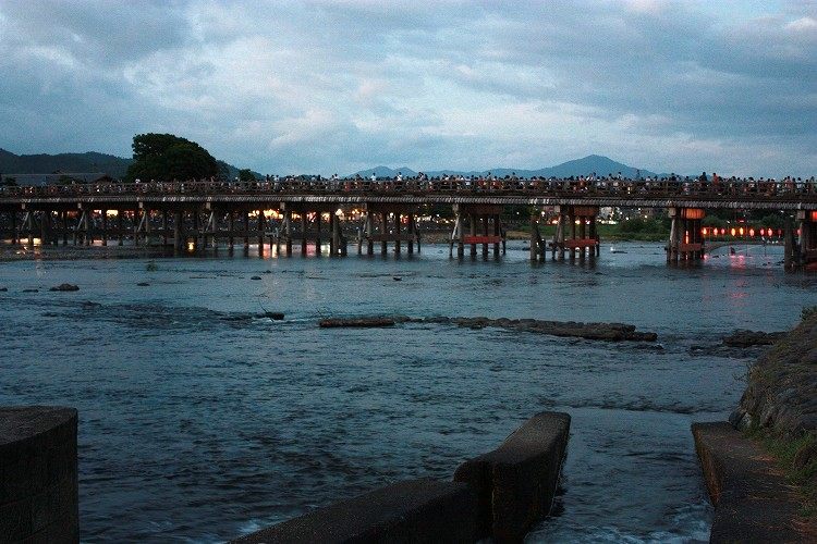 嵐山に着くと、渡月橋の上は万灯流しを見る人でいっぱいでした。