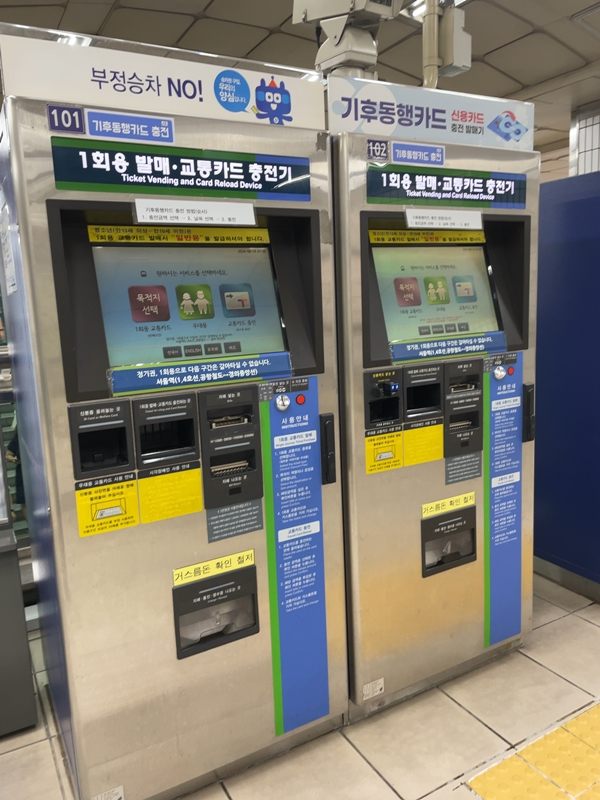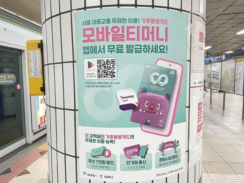 気候同行カードはAndroidフォンなどGoogle Playからアプリをダウンロードできる機種の場合はモバイルT-moneyアプリで発行できますが、iPhoneの場合はアプリがないため、実物カード(3,000ウォン)を駅の顧客安全室や駅近くのコンビニで購入し、チャージしてから使用できます。