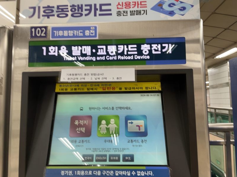 気候同行カードの実物カードは駅の改札近くにあるチャージ機でチャージが可能です。交通カードのチャージと同様にカードを置いて、表示画面通りに進んでいくとチャージができます。日本語表示できますので、日本語に変更して、チャージするとわかりやすいです。