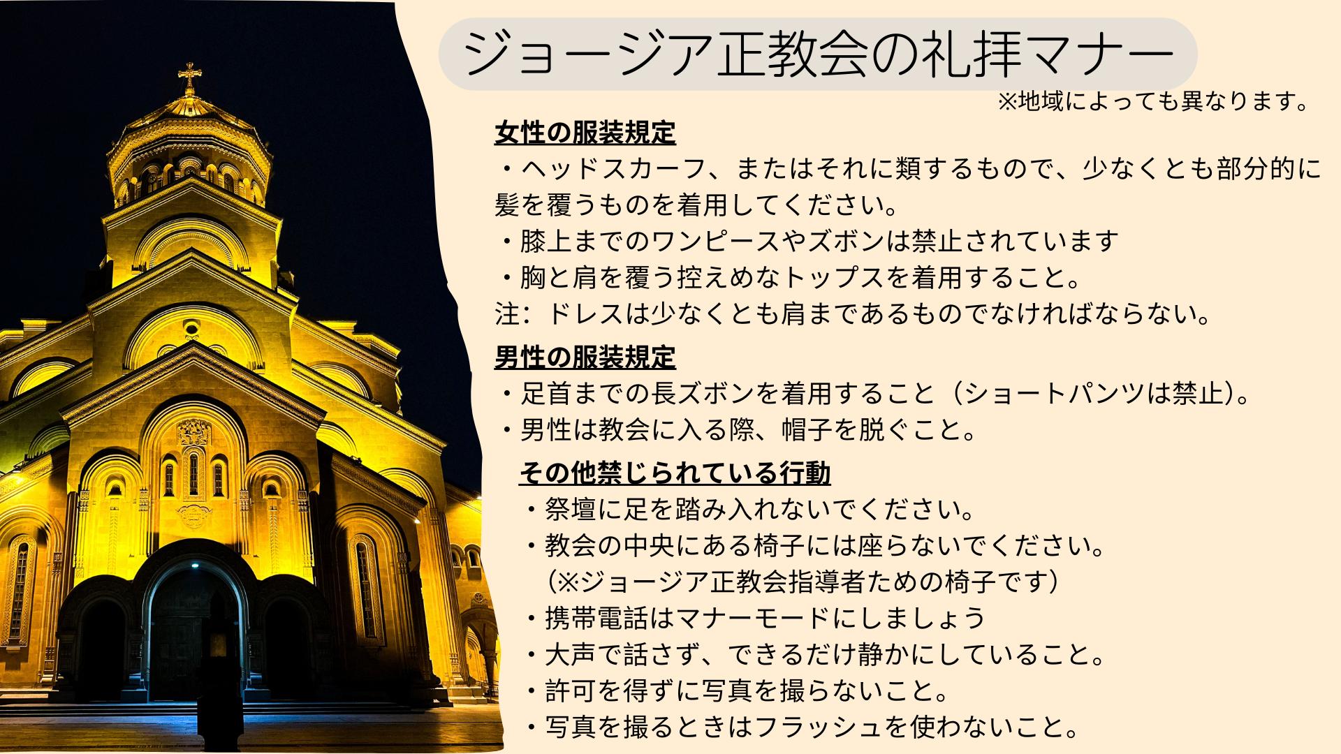 ツアーに参加されている方や、ジョージア人の方と一緒に教会に向かわれる方は、知識としてのマナーをご自身で持っていながらも、一緒に行かれる方のご指摘を柔軟に聞いて対応していただければと思います。