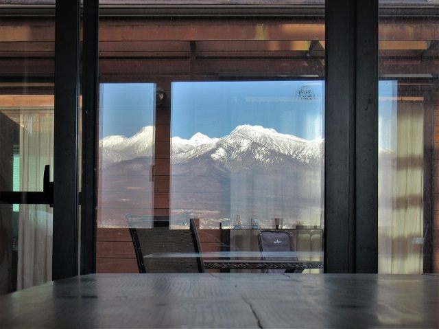 これは同日、北側の八ヶ岳が南側のウッドデッキの出入口になっている窓に映った写真です。