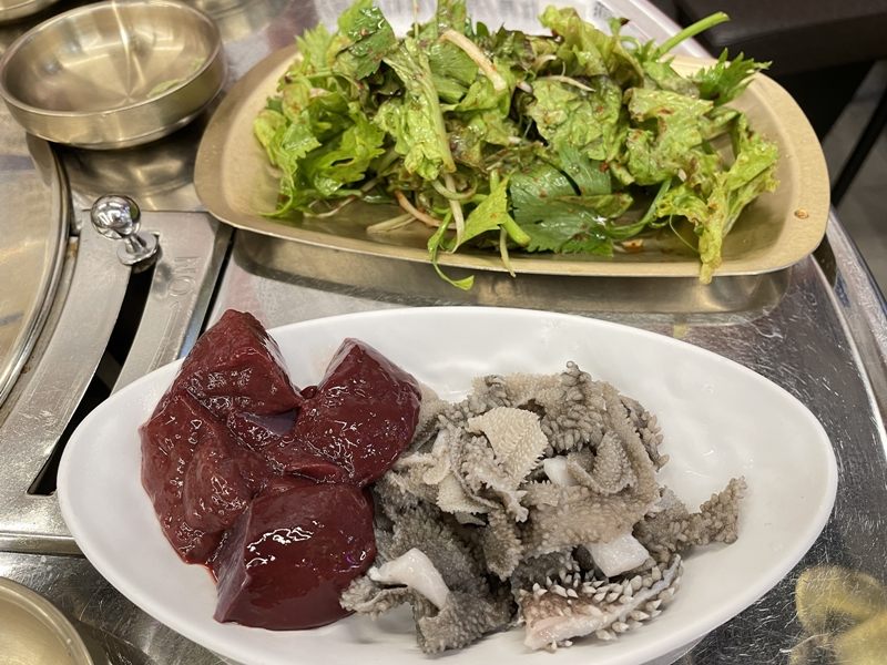 注文すると、サラダ、生レバー、センマイにテンジャンチゲが出てきます。