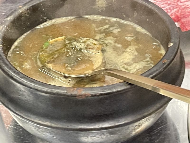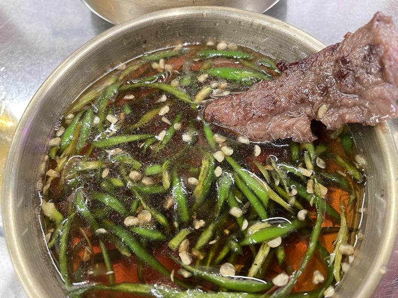 日によって違うかもしれませんが、この日は牛刺身のサービスを出してくれました。ゴマ油と絡まった生の牛肉はとても味わい深かったです。市場の側なので新鮮な牛肉が味わえるのがいいですね。