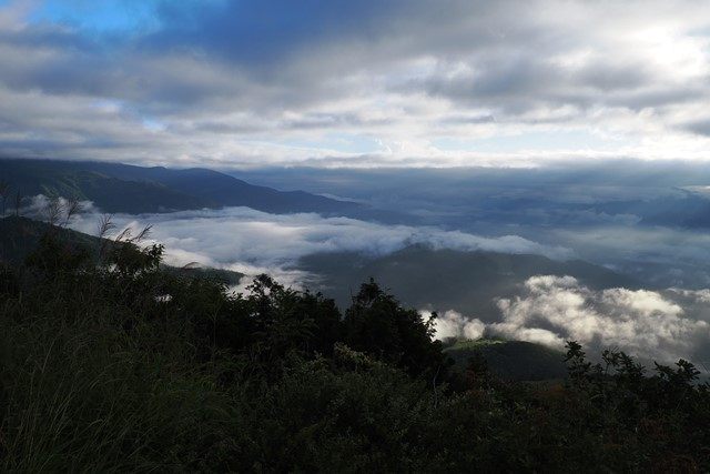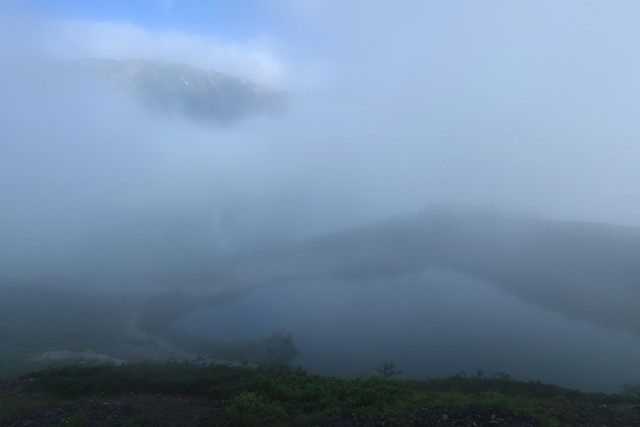 第3ケルン前より、八方池を望みます。薄っすらとではありますが、奇跡的に稜線の一部が見えた瞬間の一枚です。