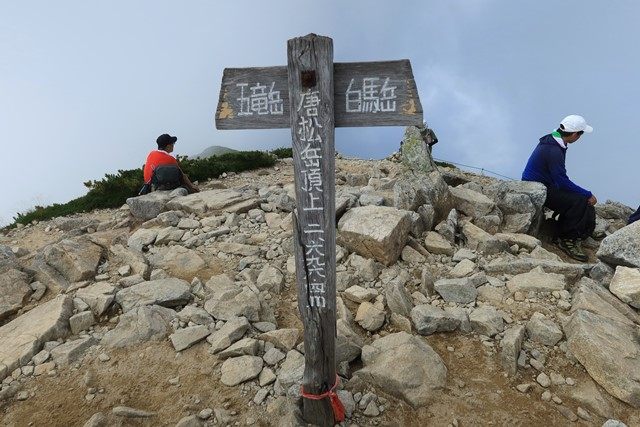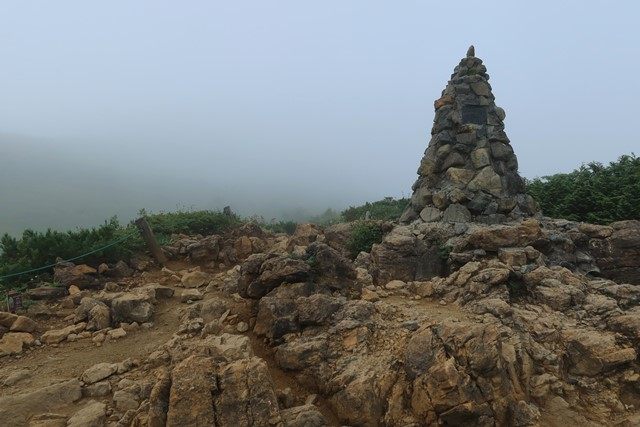 尾根道と合流し、八方山ケルンへ。この先に見える美しき山の稜線は、残念ながらガスの中です…><
