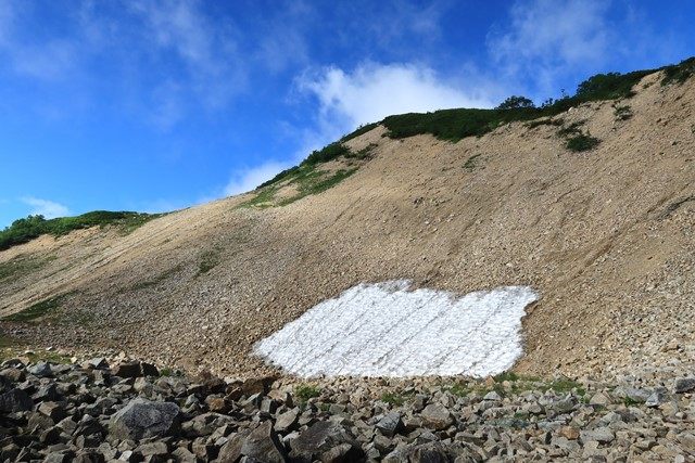 かなり小さくなった扇雪渓です。ここでガスが抜け、この日一番の青空が姿を現してくれました。
