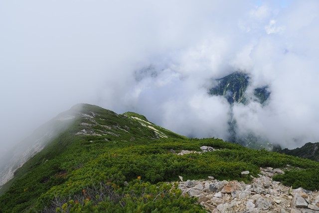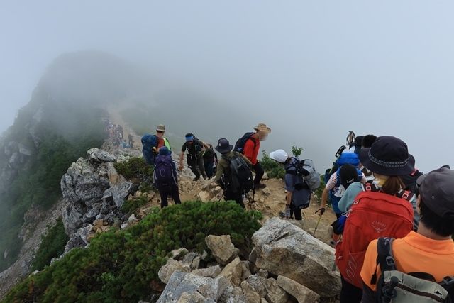 また直ぐにガスに覆われてしまいます。そんな中、稜線上に細く続く岩場を抜けます。