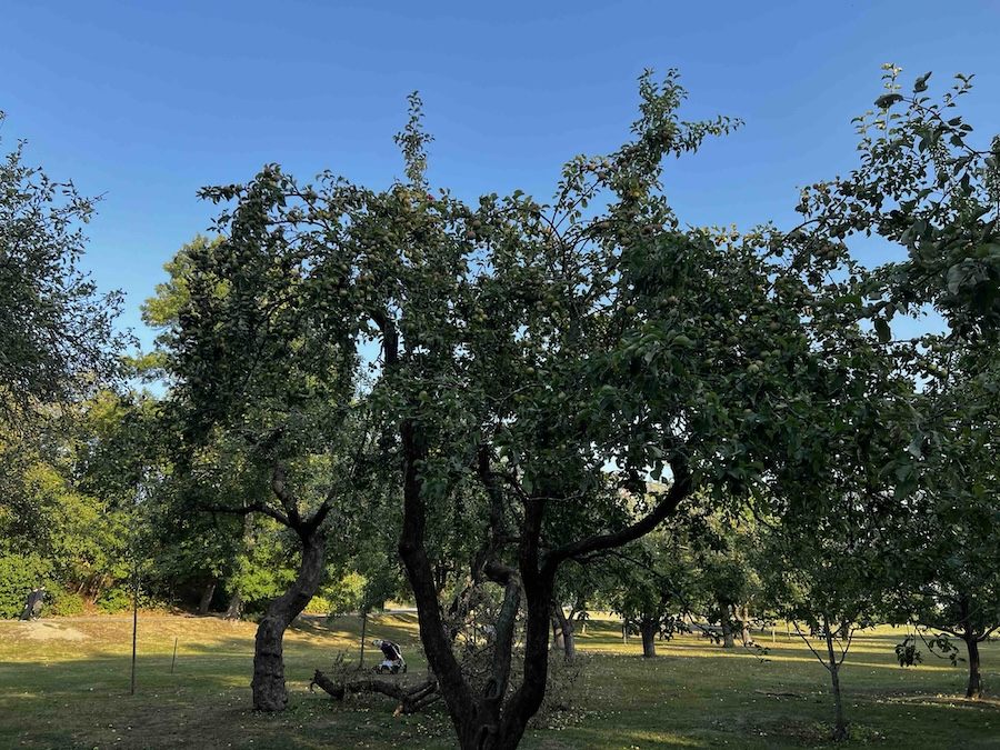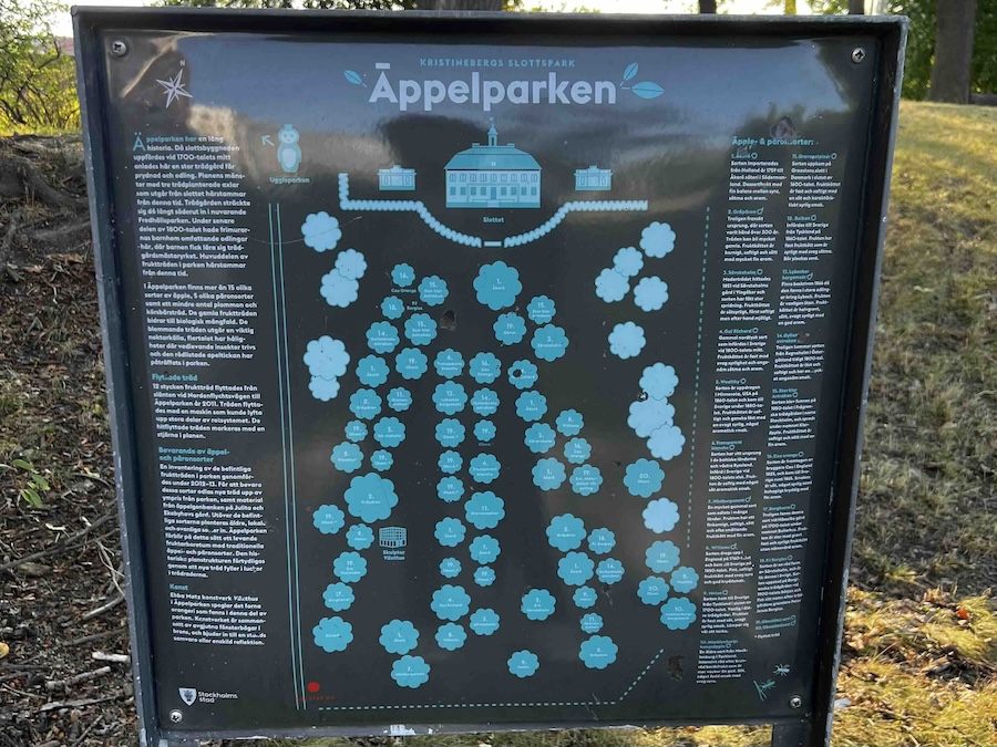 場所は、ストックホルム中央駅からグリーンラインで10分ほどのKristineberg駅そばにあるKristinebergs slottpark内のÄppelparken(エッペルパルケン、=りんご園)です。このりんご園は、王族もかつては邸宅として使用したことがあり、現在は小学校として利用されているクリスティンベリパレスが建てられた18世紀半ばからあり、現在は15種類以上のりんご、5種類のなし、そして数種類の梅や桜が植えられています。