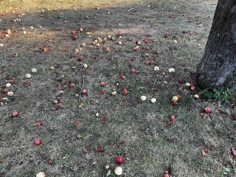 青いりんごは木の高いところに、そして落ちてしまったりんごは草の上にたくさん見つかります。