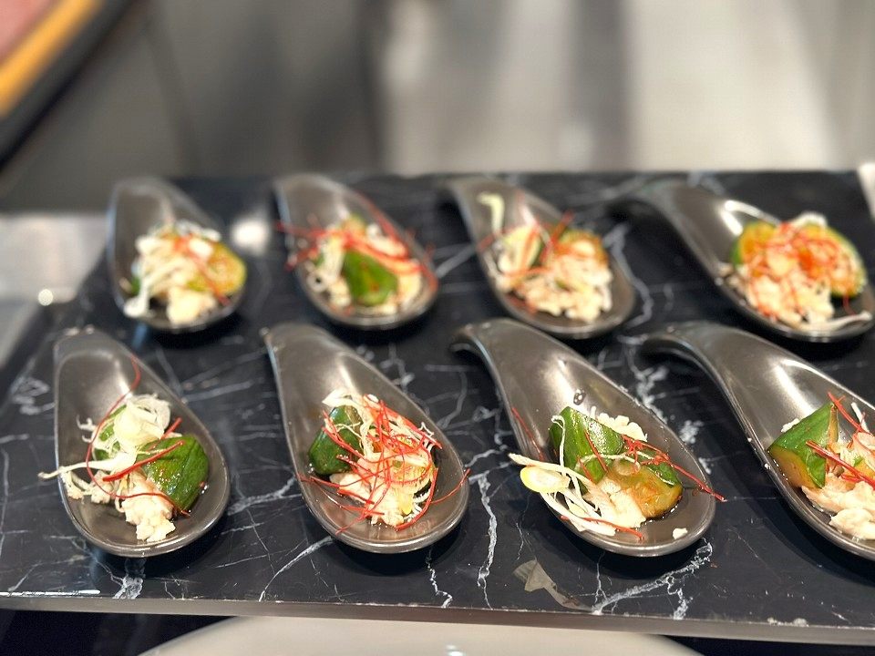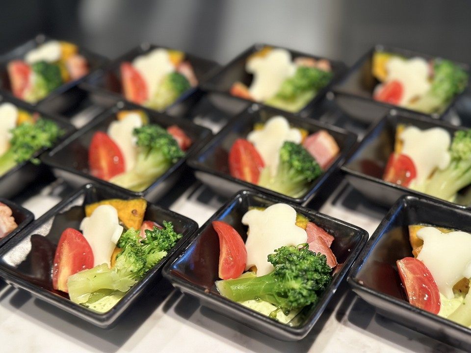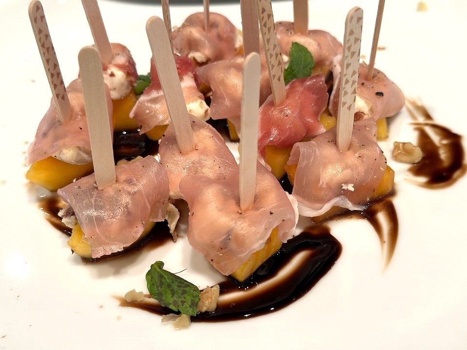 一口サイズで、取りやすく食べやすいパーティ料理のようです。イカ墨のフリッタータは、妖しく光る光沢のある黒色で、奥深い味わいです。カキとチーズの生ハム巻きは甘味と塩味が絶妙です。
