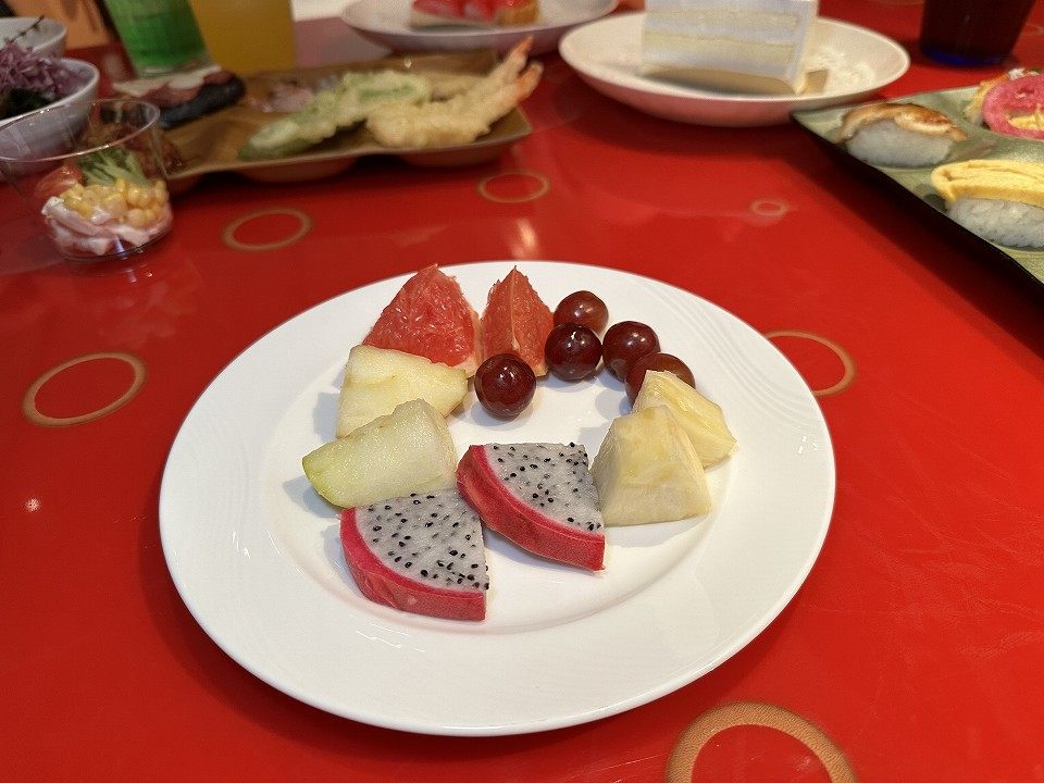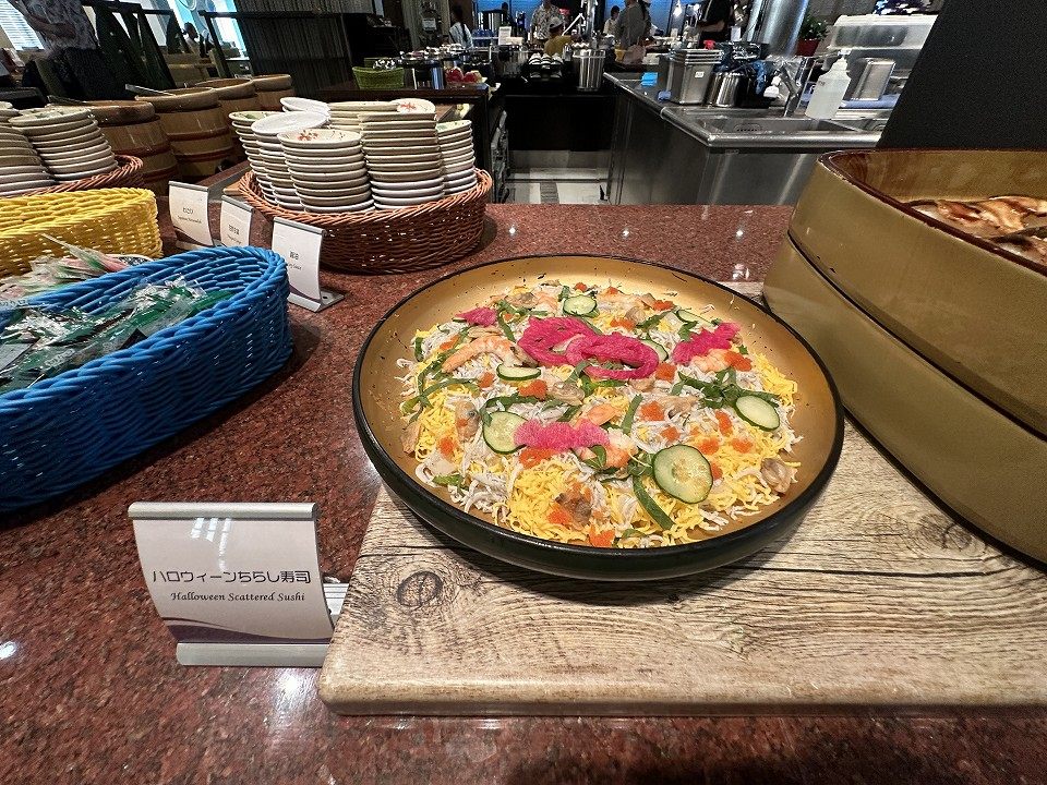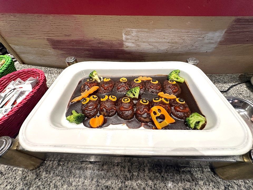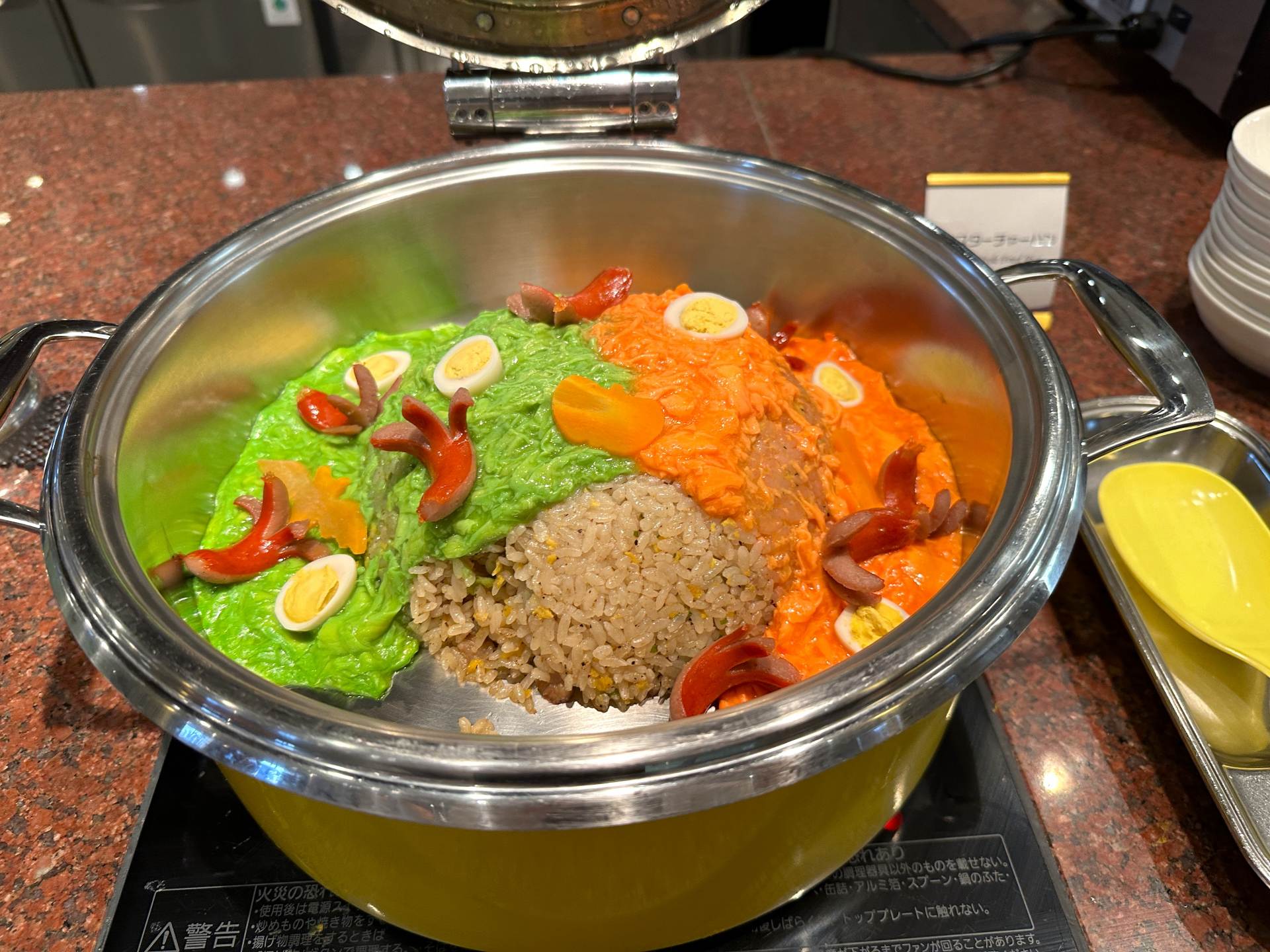 鮮やかな2色のチャーハン、グリーンとオレンジは何で出来てると思いますか?シェフにお聞きしました。スクランブルエッグに、それぞれ、色素を加えてハロウィンを演出されていました。ふんわりとしたスクランブルエッグと一緒に食べるチャーハン、ユニークな色ですが、お味は流石ホテルメイドの美味しさです。