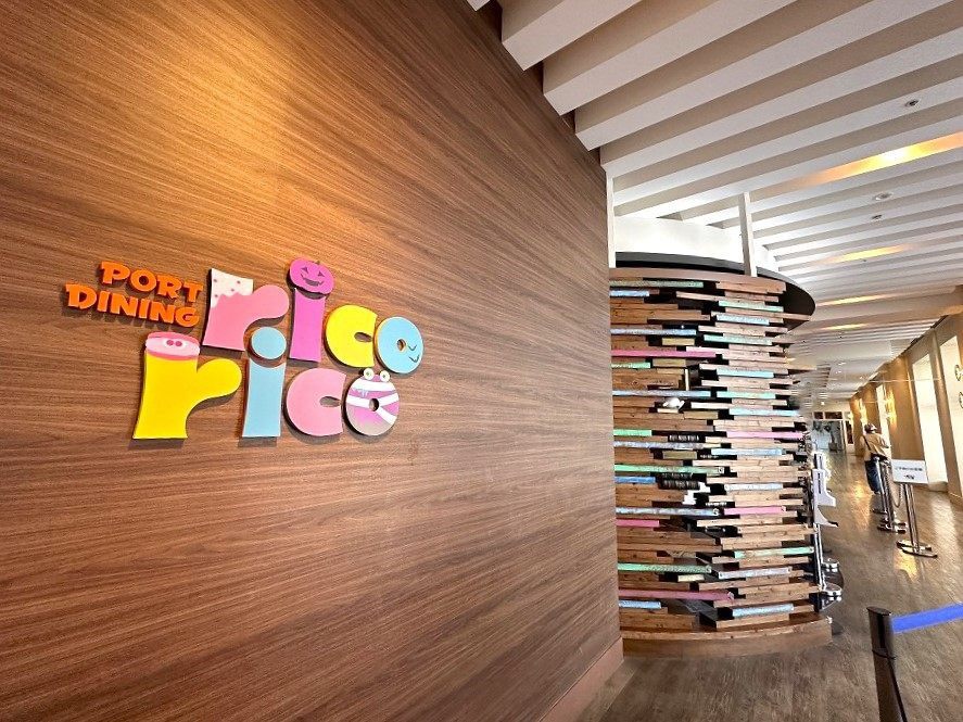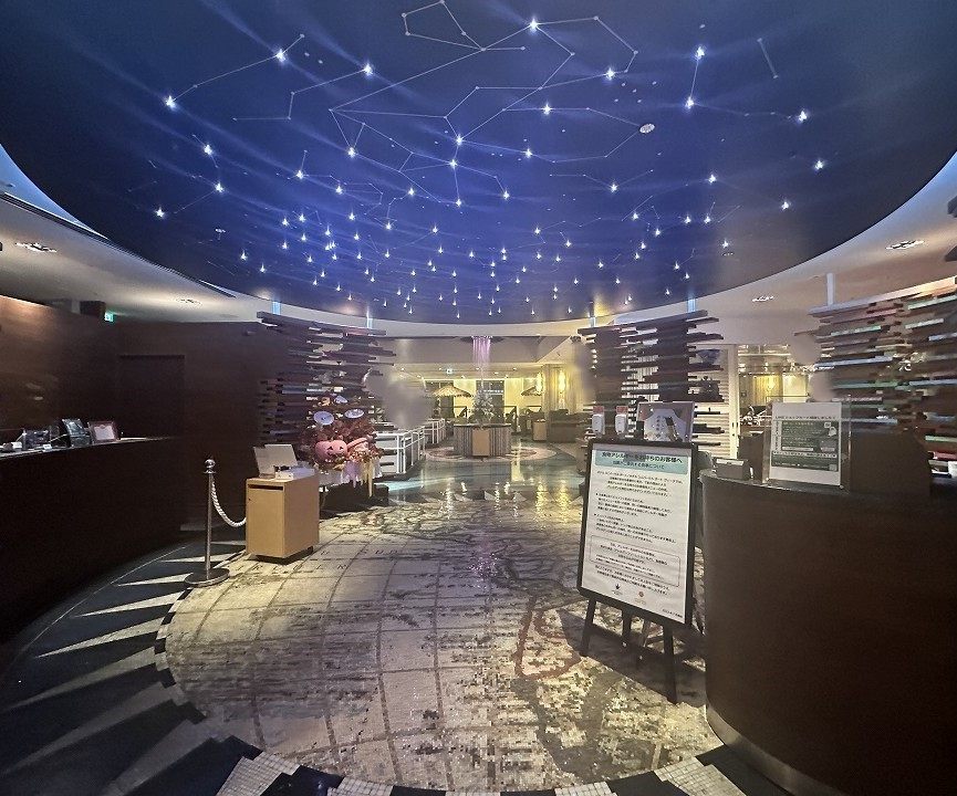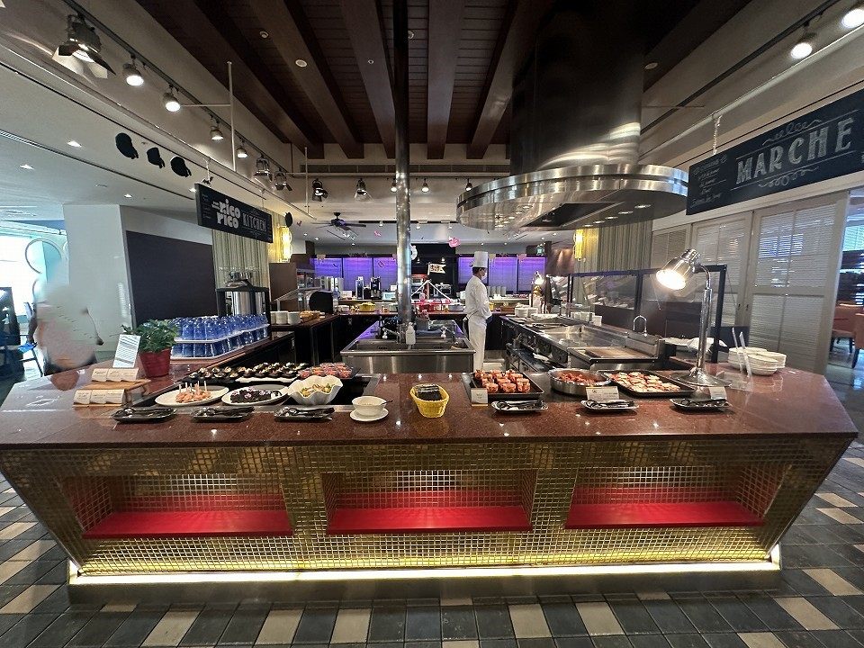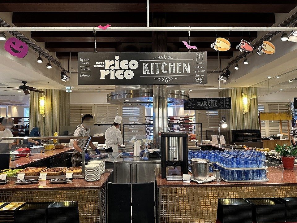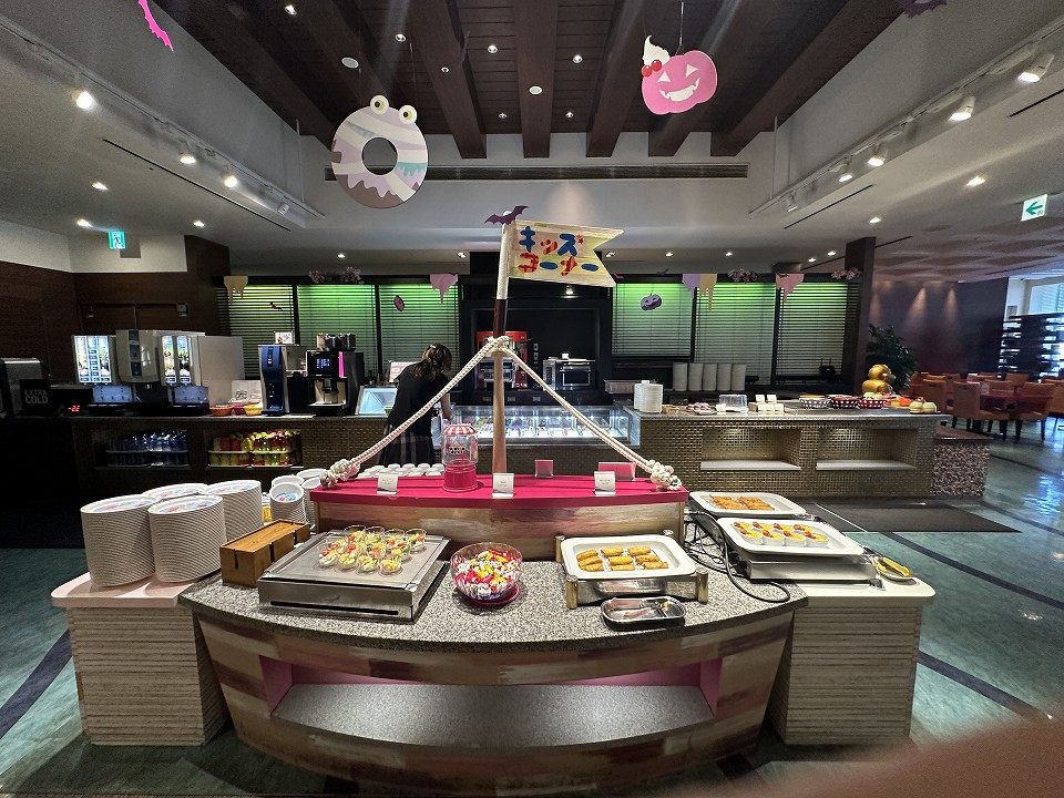 「秋の味覚とハロウィーンフェア」は、2階ポートダイニング リコリコで開催中です。リコリコは「Treasure Hunting(宝探し)」をコンセプトに、航海する船や島をイメージしたレストランです。エントランスには航海図や星座が描かれ、ビュッフェカウンターには宝物に見立てた料理が並んでいます。