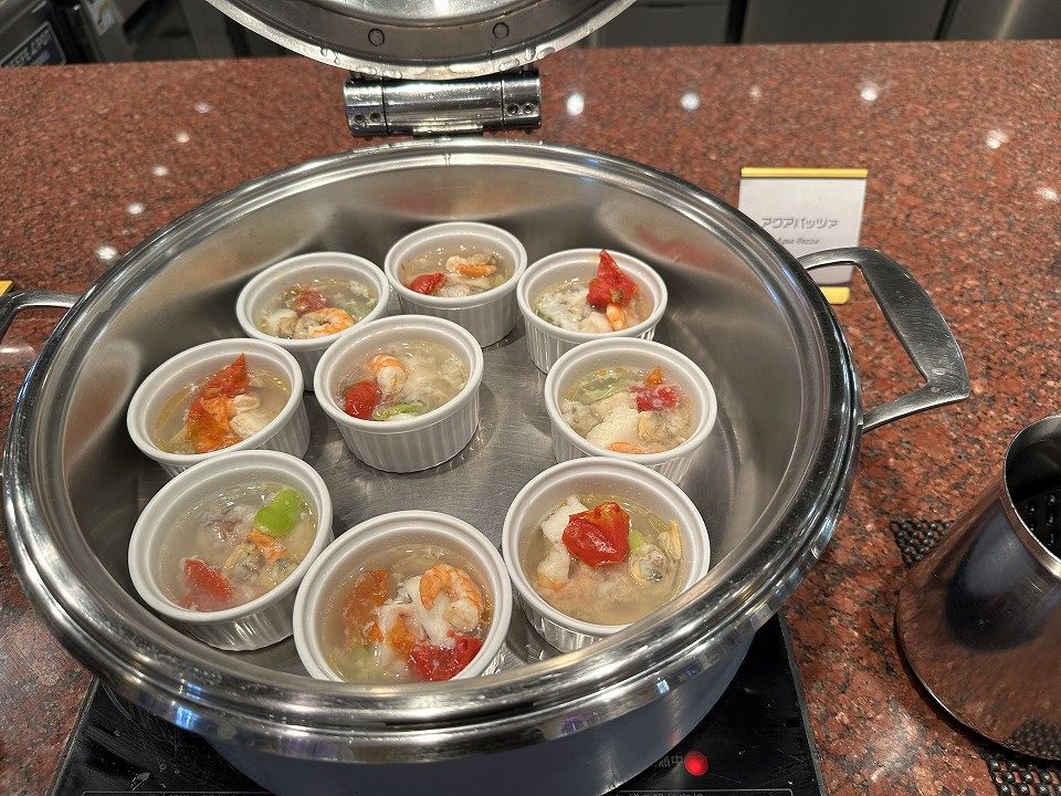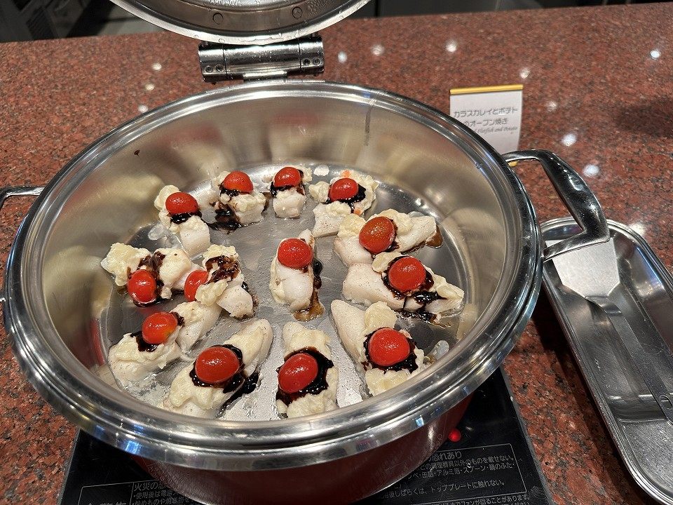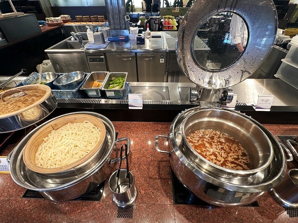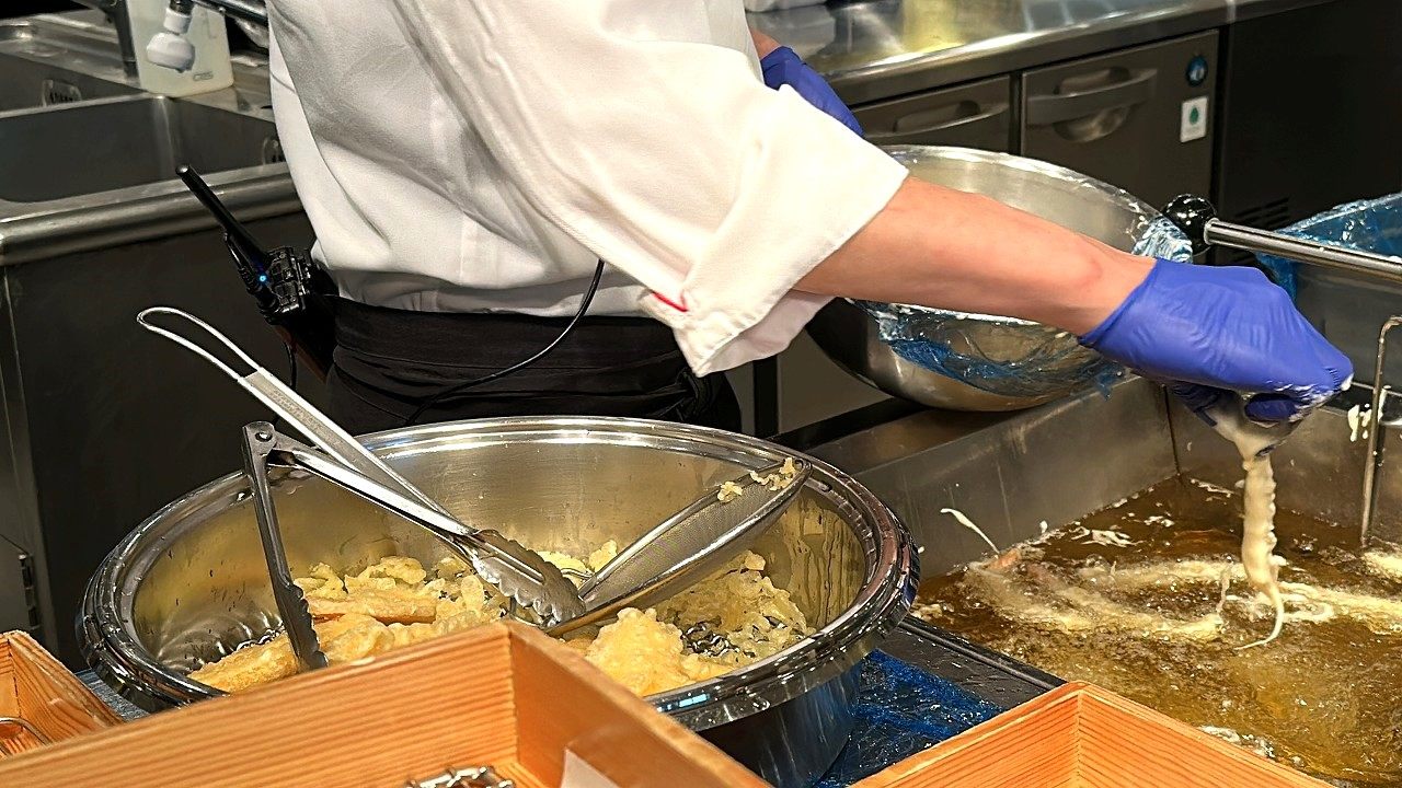 この日の天ぷらは、えびと季節の野菜が揚げられています。衣がサクッとした揚げたてがビュッフェで食べられるのは嬉しいですね。天つゆや塩でお召し上がりください。