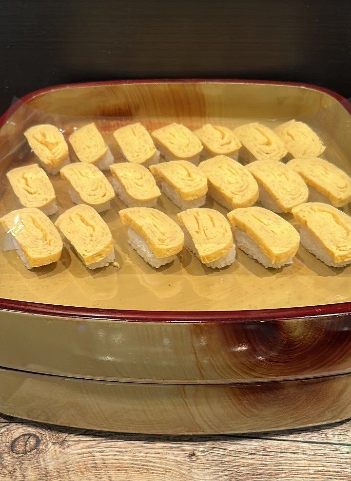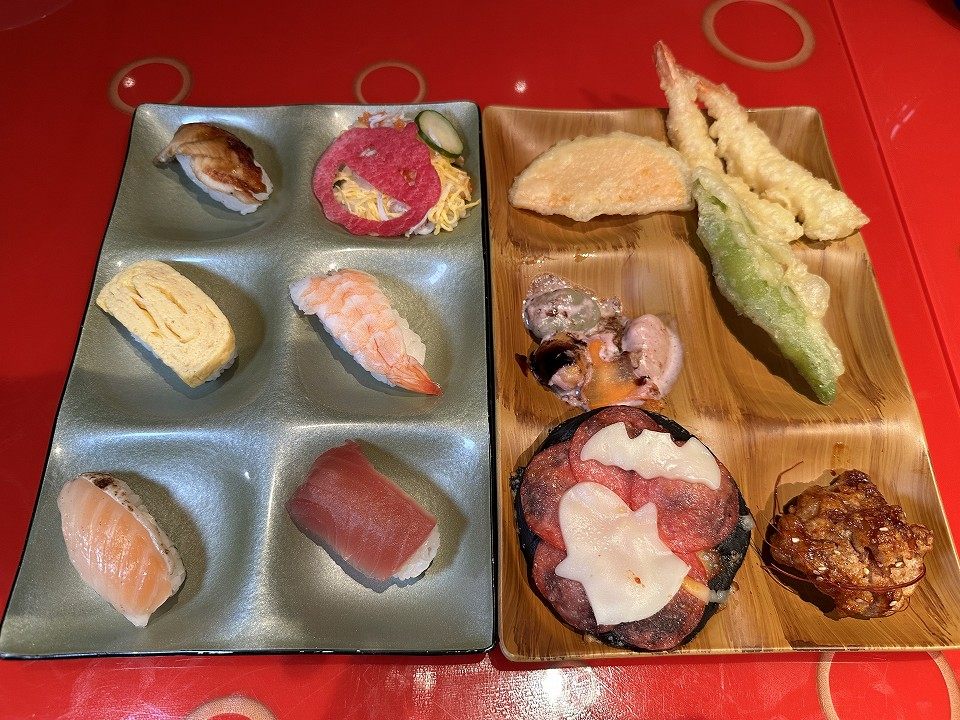 寿司コーナーは本日のネタがボードで表示されています。炙りまぐろは、外側は香ばしく炙られ、オニオンペッパーがまぐろの旨味を引き立てています。