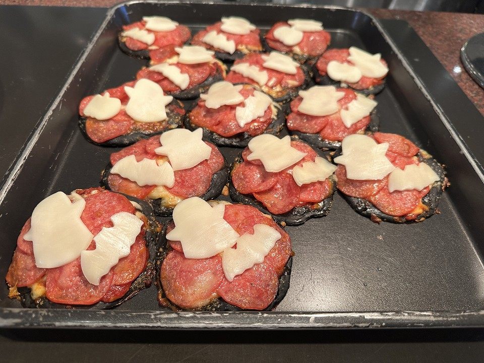 ハロウィーンピザの生地はイカスミが混ぜ込まれ、真っ黒ですが、モチモチ食感で美味しい。おばけとコウモリはチーズがあしらわれています。