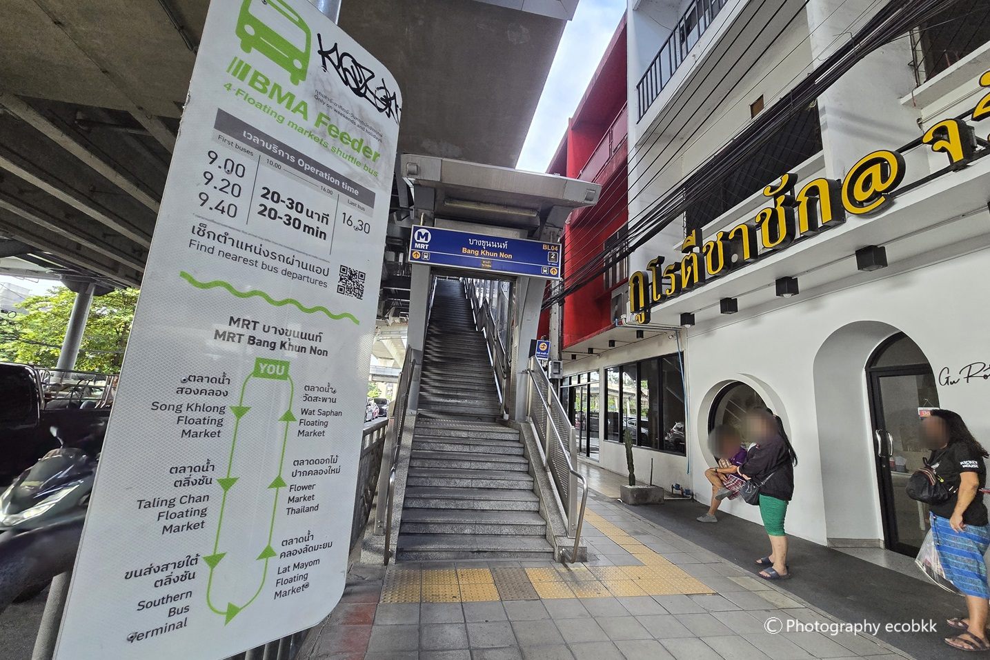 現在、土日・祝日限定で、MRTバーンクンノン(Bang Khun Non)から、バンコク・タリンチャン地区にある4ヶ所の水上マーケットを巡る白いバス(BMA Feeder Bus)が無料で運行しています。乗り場はMRTバーンクンノン駅の2番出口を出た場所にあります。2番出口の階段を降りると、目の前にバス停の標識があり、そこにバスがやってきます(エレベーターで降りたところにはありませんのでご注意ください)。今回、始発の9時前に近くにいたら、他にも乗る人が多く、分かりやすかったです。