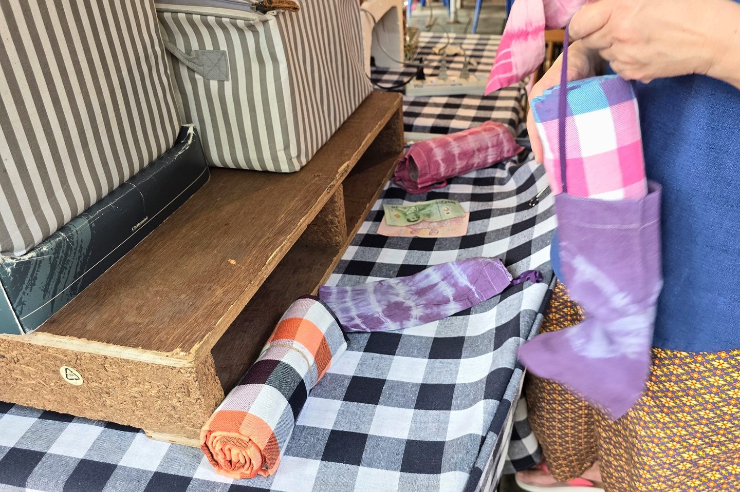 帰りは、入口入ってすぐ右手にあったタイのイサーン地方でよく使われるパーカオーの布等を販売しているお店があったので、友達は2つ、私は3つ購入して帰りました。素朴な水上マーケットならではなのか、1セット120バーツ~で、入れ物もつけてくれて、店舗で購入できる店舗では良心的な価格だなと感じました。聞くと、各商品の使い方等も丁寧に説明してくれます。このパーカオーという布は、タイでは男性がお風呂上りに体に巻くものとして使う布ですが、最近ではカバン等にも使われるのをよく目にする布でもあります。筆者はカバンやテーブルクロス等に使うために購入しました。