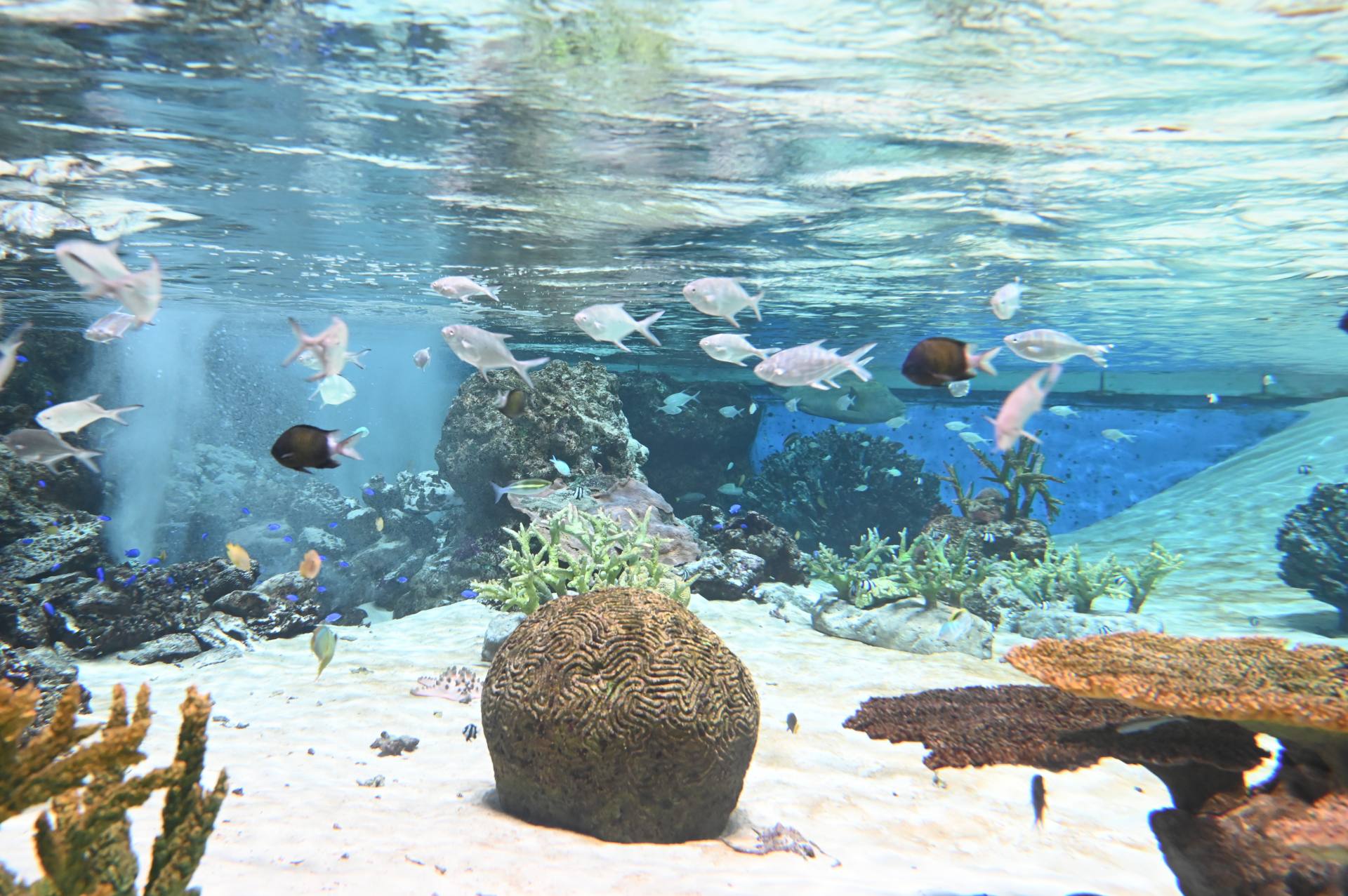 いちばん大きな水槽のトロピカルライフ外洋のフーディングタイムは15:00で、エイやサメが乱舞しますのでぜひ見て欲しいです。