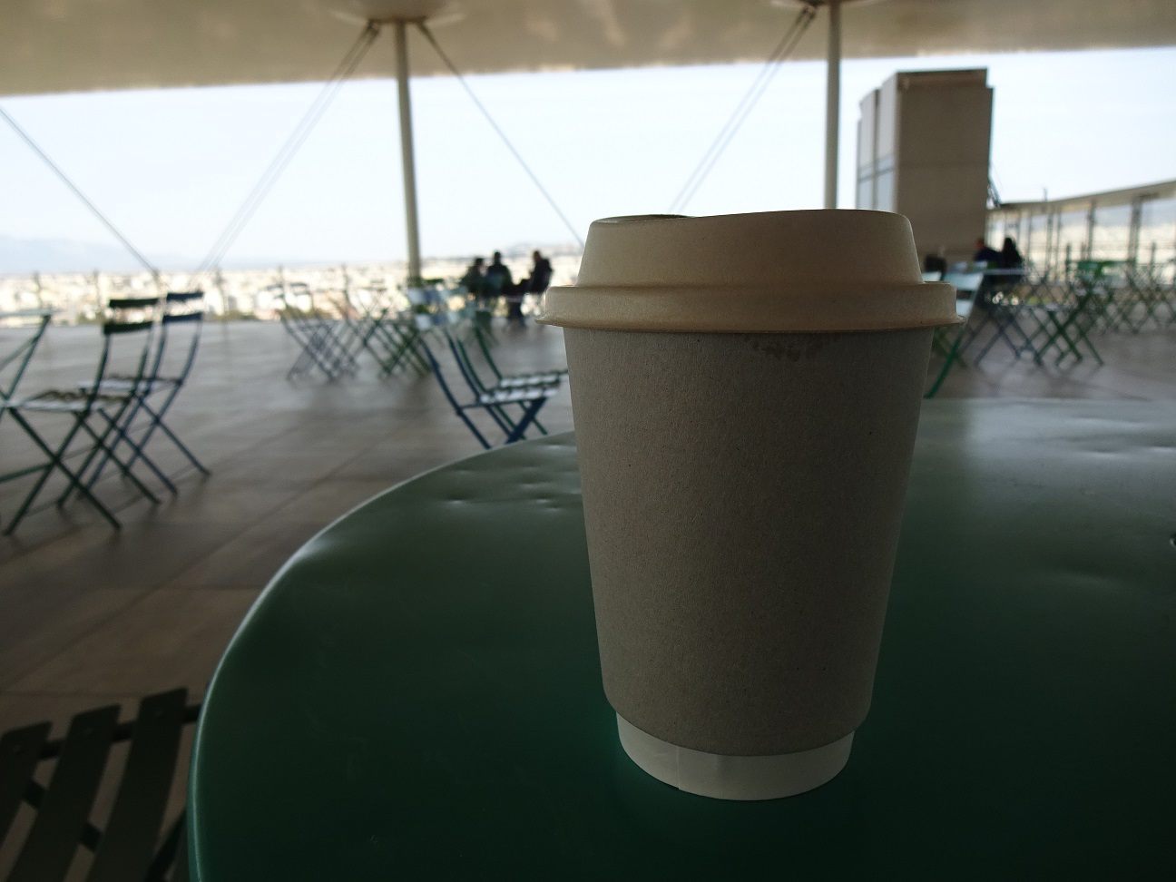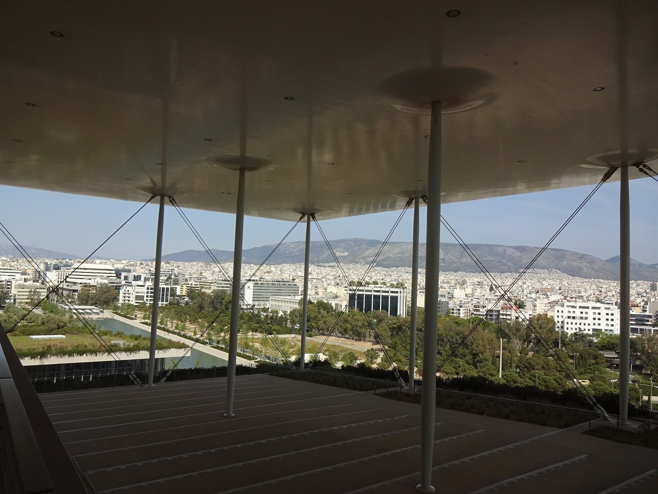 庭園から見た「小さな建物」は最上階テラスで、屋根にはソーラーパネル。展望台を兼ねているテラスからピレウス湾や運河を見晴らしながら、併設カフェでお茶しました。