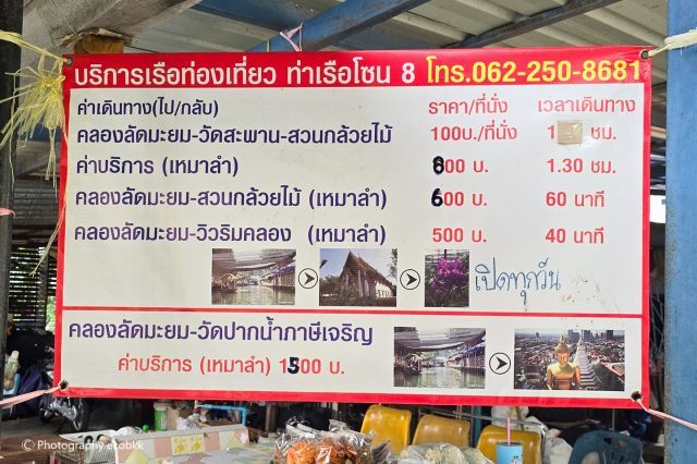 運河沿いを歩いていると、このボートツアー案内の看板が数ヶ所設置されていました。私のタイ語能力では、この看板のタイ語表記だけではよくわからなかったので質問したかったのですが無人で、今回利用するつもりがなかったので、記載の電話番号にまでは問い合わせしなかったのですが、興味のある方は直接確認してみてください。