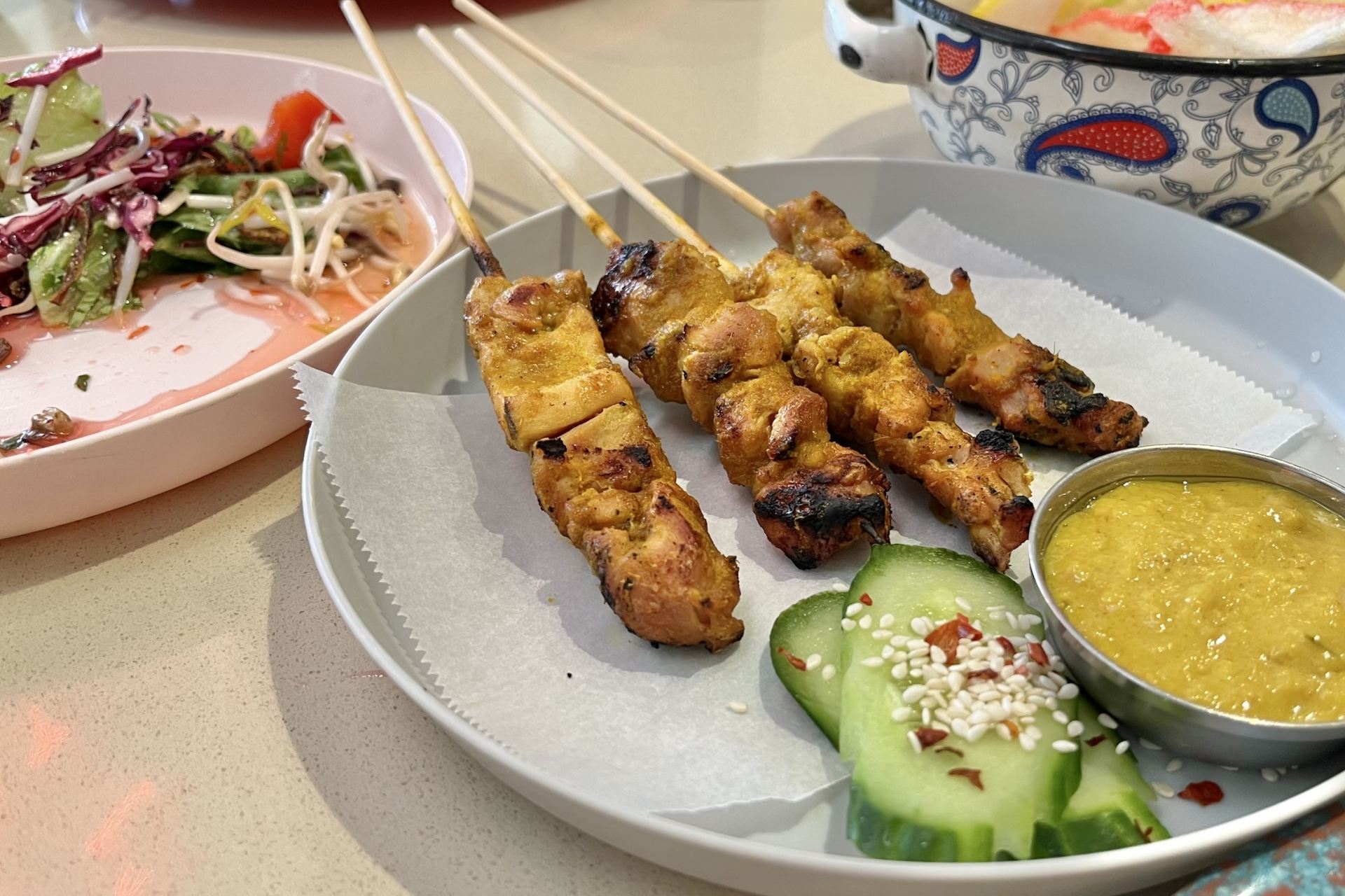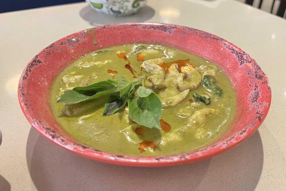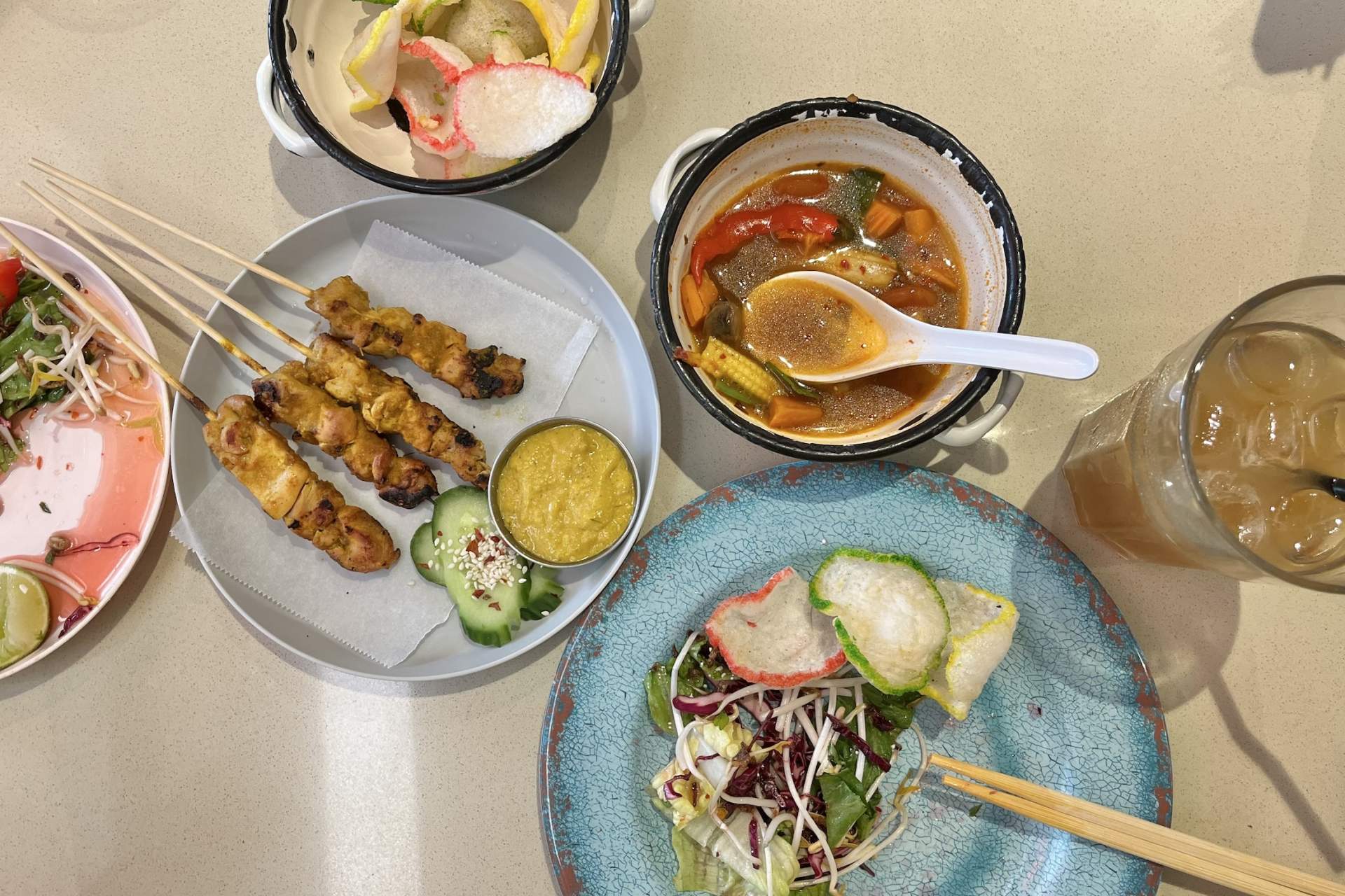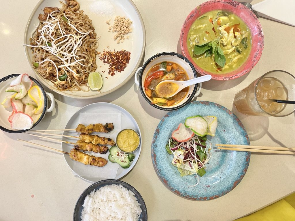 多種多様なメニューの中から今回チョイスしたのは、副菜からタイサラダ、トムヤムスープ、チキンサテー、主菜からはグリーンカレー、パッタイ、マレーカレーの合計6品。屋台のようなカラフルなお皿に乗って、次々と運ばれてくる料理の数々にテンションが上がります。メイン食材はチキン又はベジから選べ、追加料金で牛肉又はエビにも変更可能。辛さも好みに合わせて調整できます。自家製ドリンク「So Sanuk」のハイビスカス味は梅ジュースのような甘酸っぱい味で、爽やかな後味がエスニック料理に相性抜群でした。