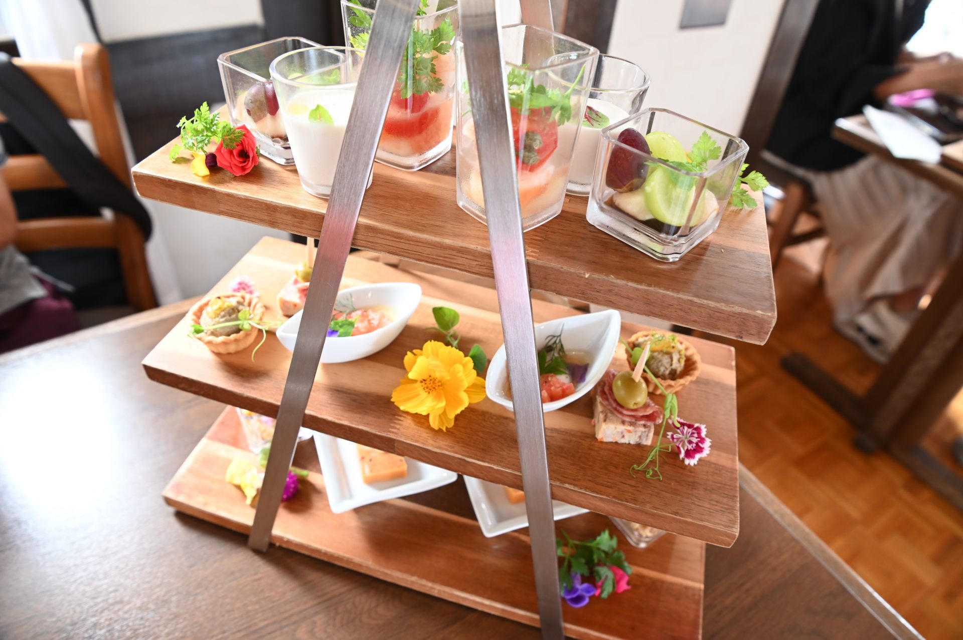 選べるメイン料理+前菜スタンド+パンのセットで、ハーブやエディブルフラワーが散りばめられた3段スタンドには可愛いと美味しいがいっぱいでした。