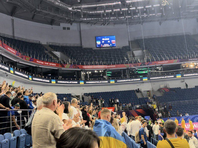 アリーナを出たところで、私もウクライナ人ファンと記念撮影し、少しお話しすることができました。夫婦で観戦しに来たとのことで、男性はウクライナ出身で今はウズベキスタン在住、そして女性はウズベク人とのこと。現在ウクライナでは原則成人男性の出国を禁じているそうで、ウクライナ人たちがウズベキスタンまでやってくるのは難しいはず。このウクライナ大応援団は、彼のようにもともと国外にいたウクライナ人や、ウクライナ系ウズベキスタン人が中心となって結成されたのでしょうか。それだけであの数のファンを動員でき、迫力ある応援を繰り広げられたのだとしたら、本当に大したものです。