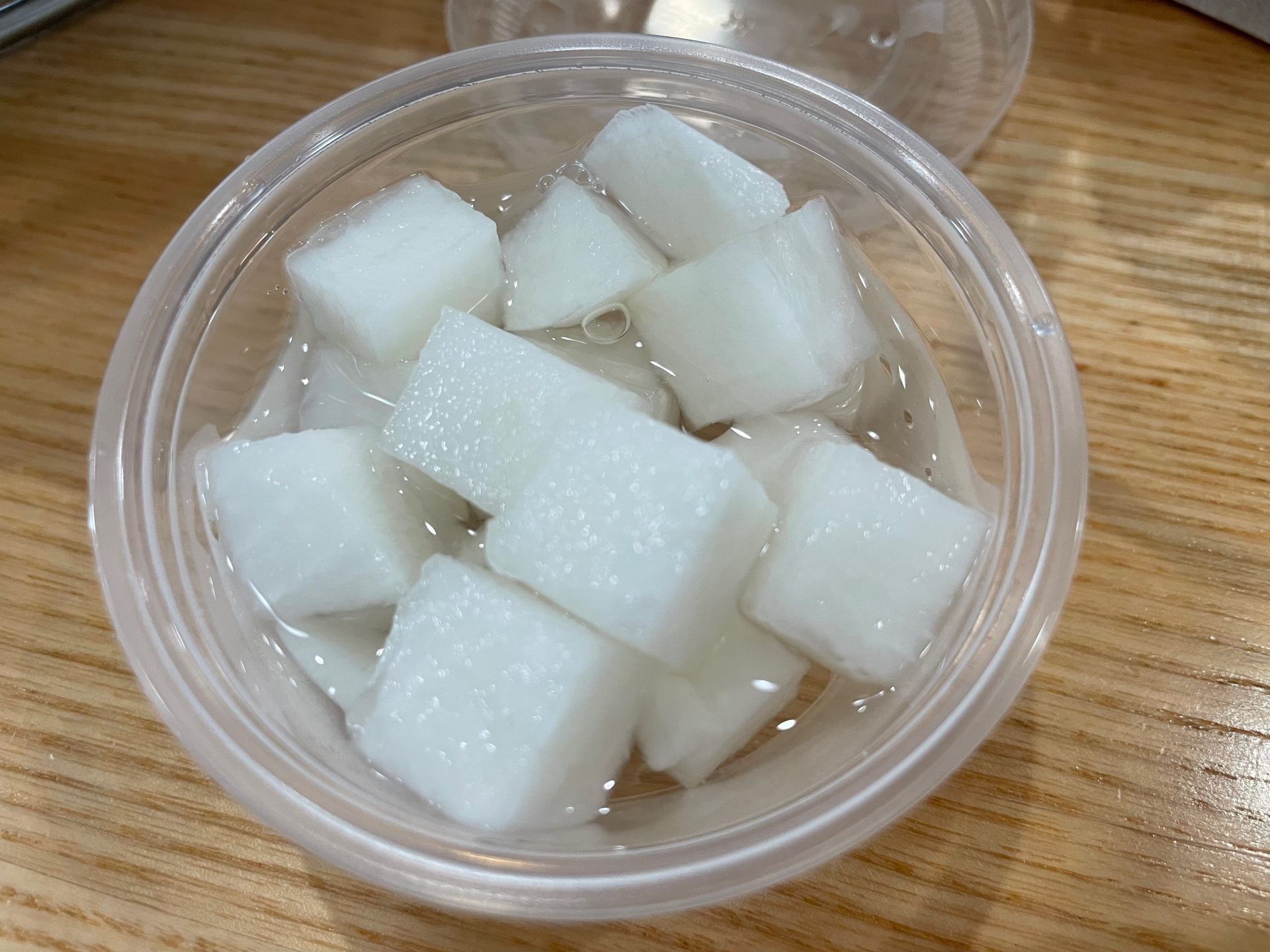 唐揚げには甘い大根のピクルスが付いてきて、ピリ辛の唐揚げやトッポッキによく合います。