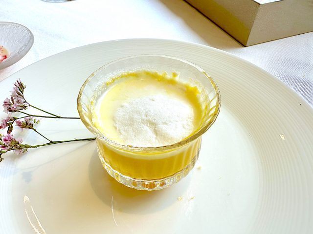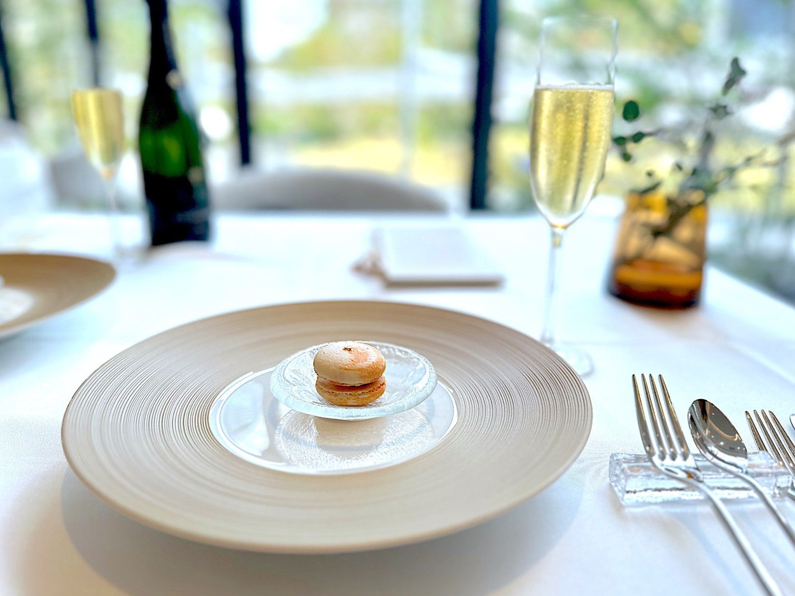 スタイリッシュなお皿に、可愛らしいマカロンが登場しました。ほんのり桜色の美しいマカロンは、見た目にも愛らしい一品です。中にはフォアグラのテリーヌと爽やかなジンジャーソースがアクセントとして挟まれています。濃厚なフォアグラの香りとジンジャーソースの香りが口に広がり、一口で華やかな印象のアミューズです。高級シャンパン“ROGER DESIVRY”との相性も抜群です。