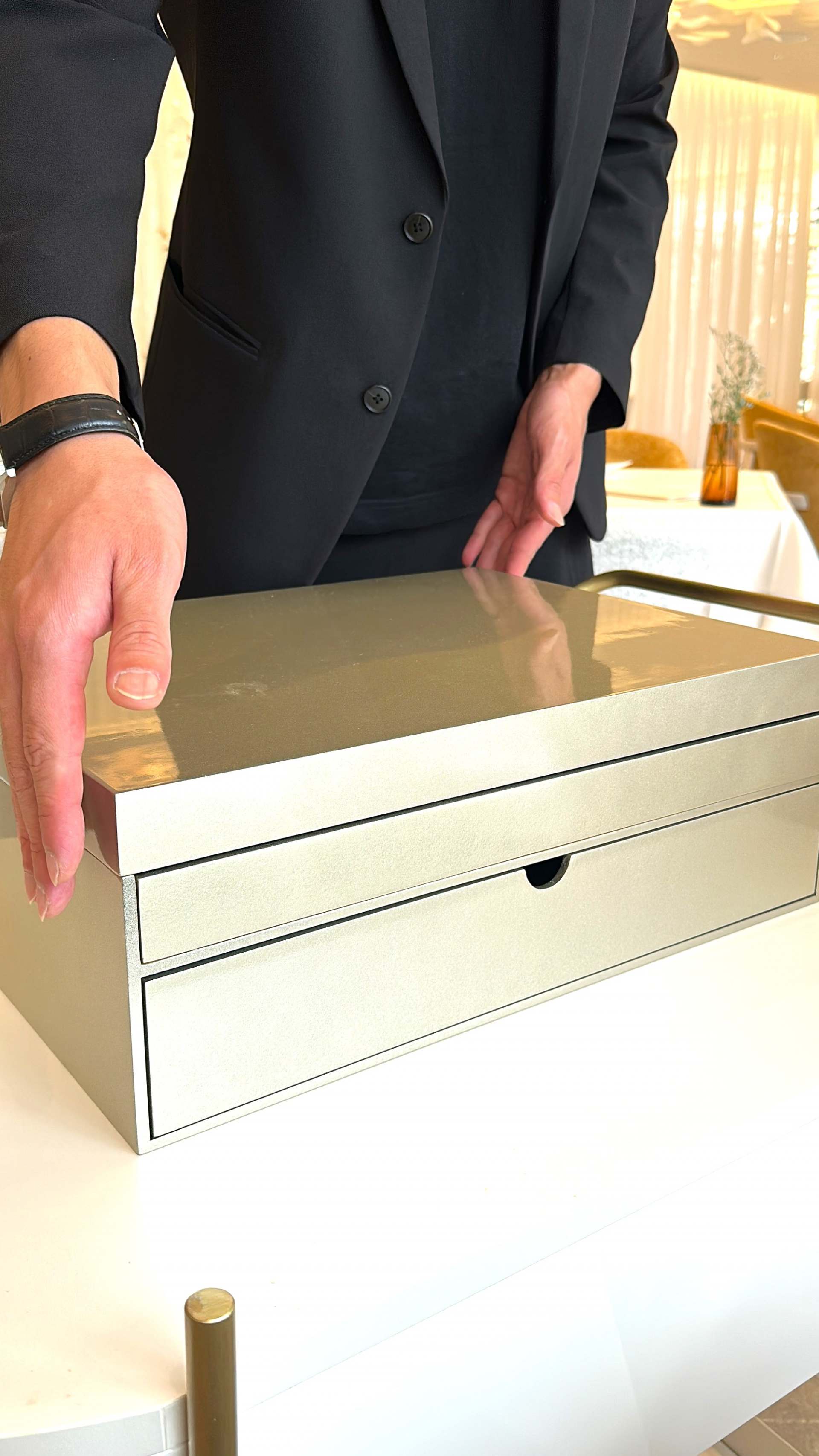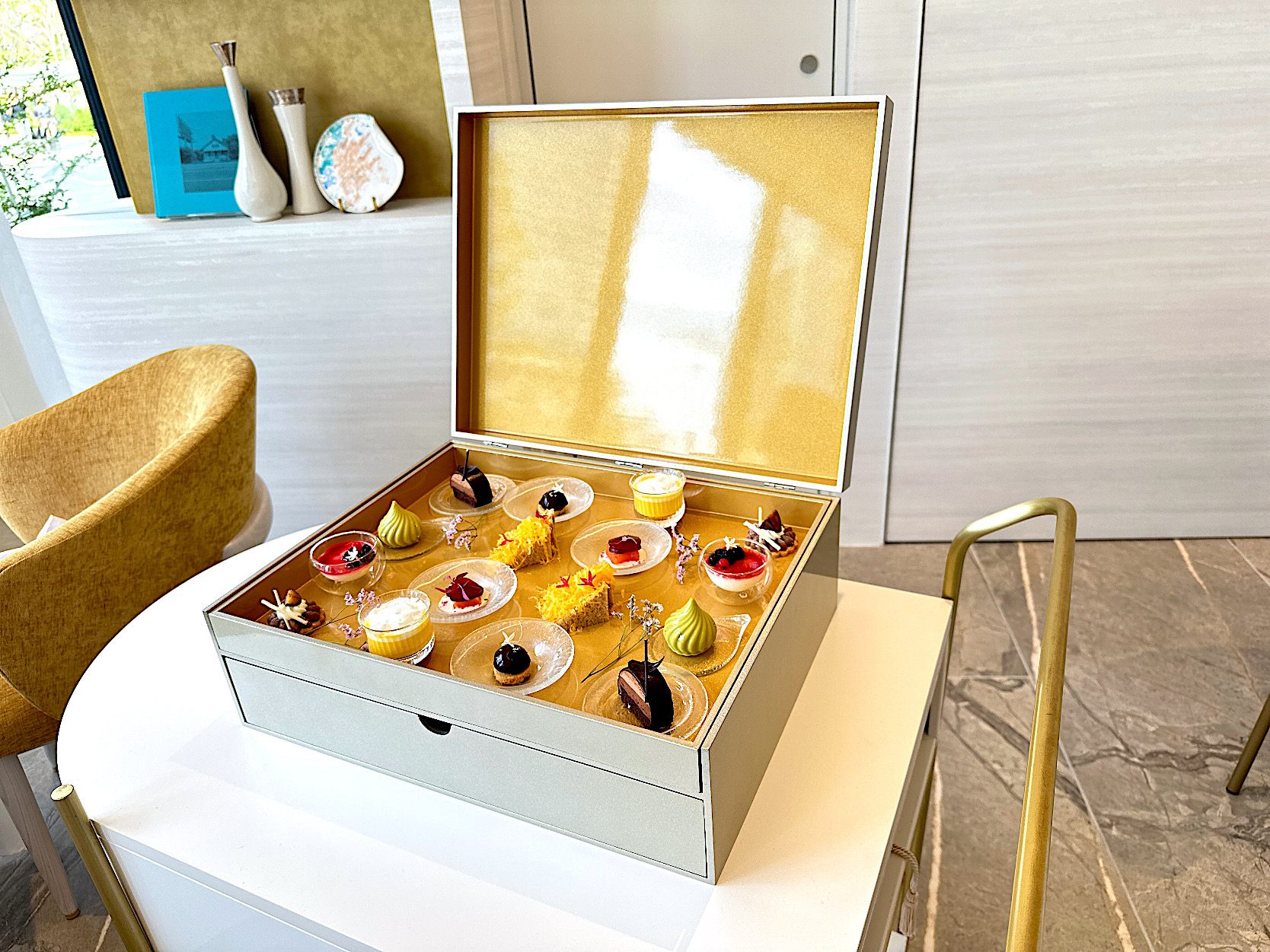 大切なものをしまっておく宝石箱のようなゴールドのティーボックスで登場するアフタヌーンティー。ワクワク感が高まります。